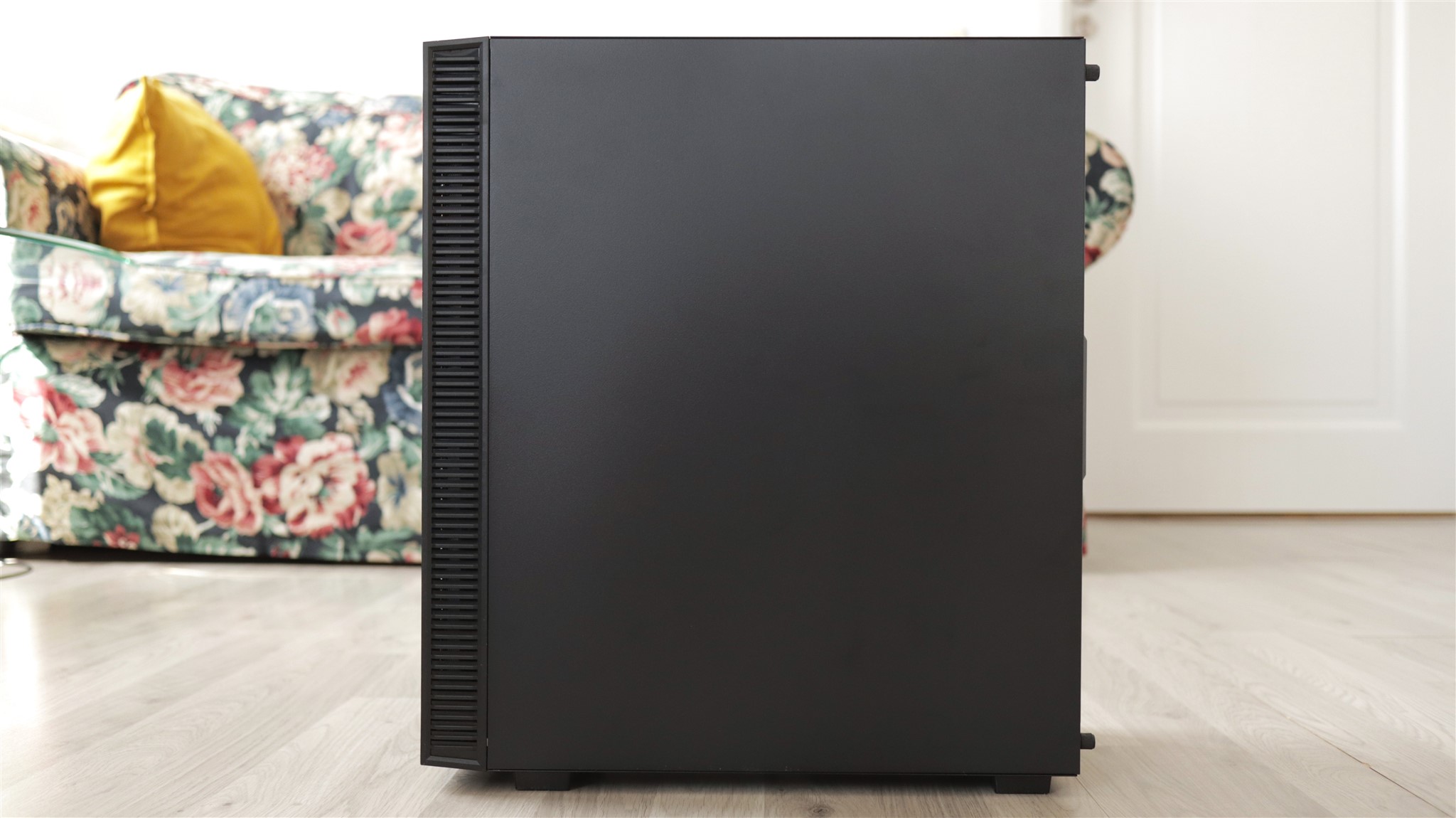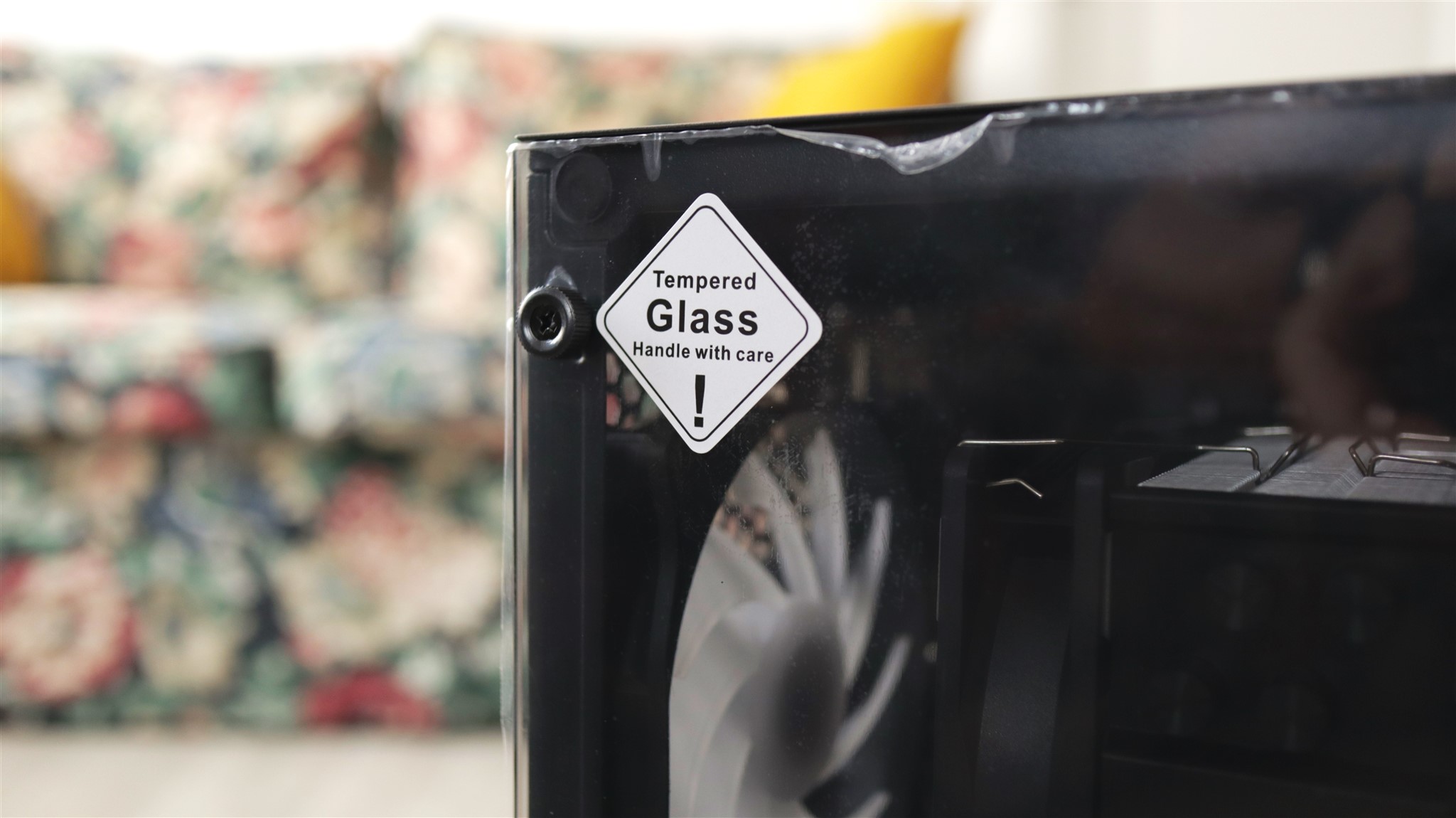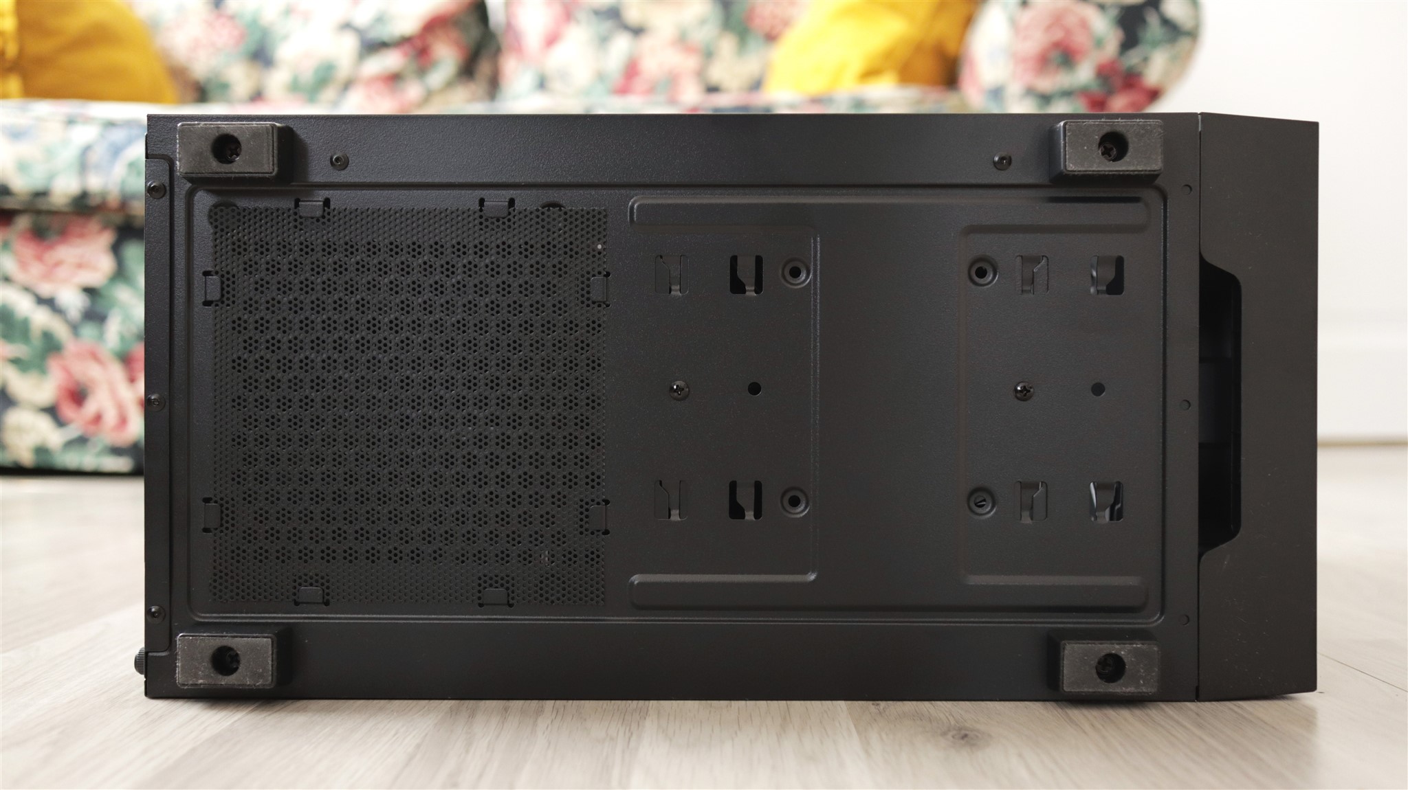 Pe laterala din stânga avem sticlă securizată, un panou care nu se desface cel mai facil, fiind ținut la loc de 4 șuruburi. Nu avem cleme sau șine, sticla este așezată pe o bază care nu o ține la locul ei după ce ai deșurubat acele 4 șuruburi, așa că trebuie să ai ceva grijă. Nimic de speriat, totuși.