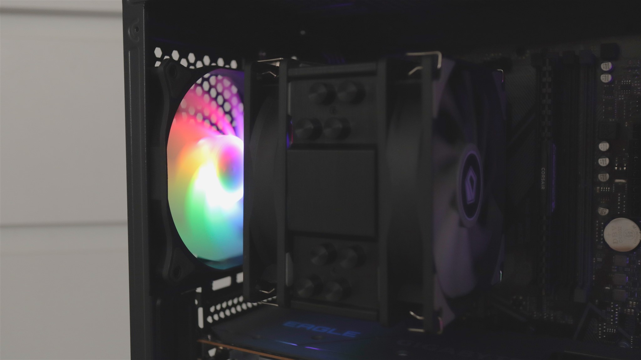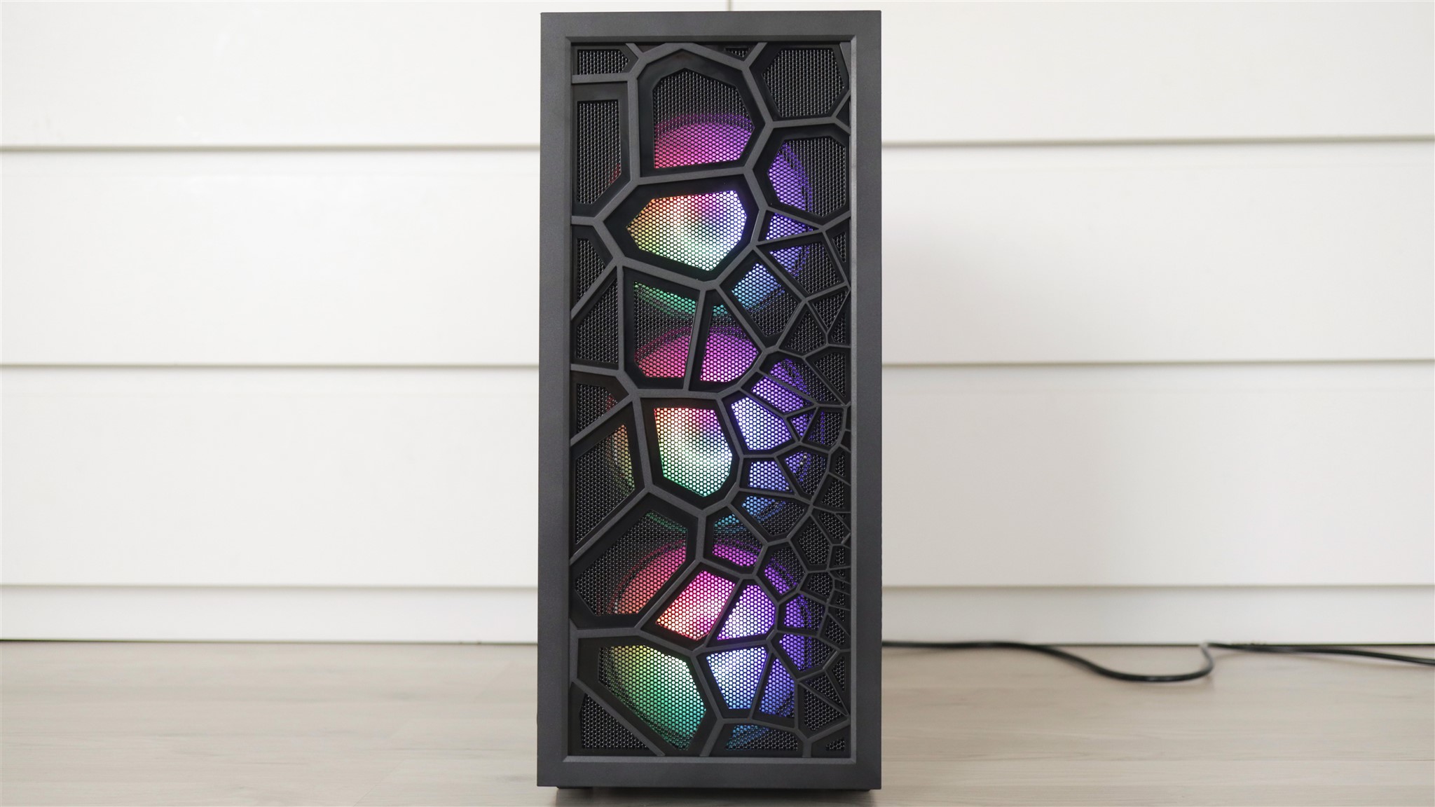 Din punct de vedere strict al designului, carcasa aduce o parte frontală destul de complicată, cu un model, aș spune abstract, adăugat peste o grilă din spatele căreia luminează cele trei ventilatoare frontale. Apropo de acestea, precum și de cel de pe spate, iluminarea nu este personalizabilă. Nicidecum, acel model multicolor este fix, nimic nu se schimbă, cum vedeți în poze iluminarea așa este mereu aprinsă.