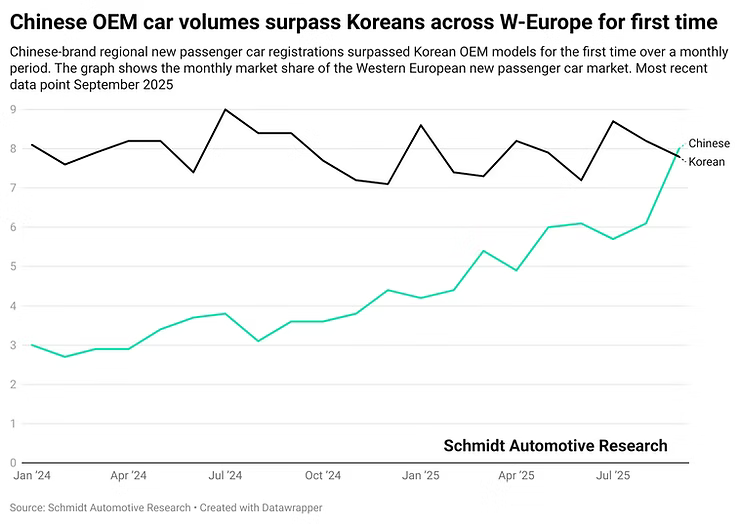 Toate brandurile din China (BYD, Geely, MG, Chery, Lynk & Co şi toate celelalte) au reuşit să înmatriculeze 88.800 unităţi (cotă de piaţă de 8%), în timp ce toate brandurile din Coreea de Sud (Hyundai, Kia, KGM aka Ssangyong etc.) au reuşit să înmatriculeze 86.700 unităţi (cotă de piaţă de 7.8%).