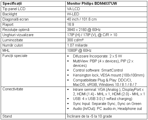 Monitorul Philips BDM4037UW va fi disponibil în magazinele de specialitate începând cu luna aceasta, la un preț recomandat de 3.369 lei.