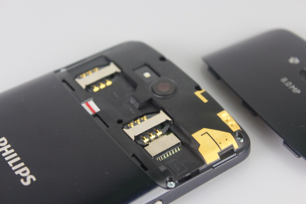 Telefonul este dual-sim, dar nu oferă acces la bateria de 3300 mAh. Capacul acoperă o mică parte din spatele telefonului, în zona camerei de 8 Megapixeli cu LED flash. Sub capac dați de cele două cartele SIM de dimensiuni normale și de slotul pentru microSD de până la 32 GB. În galeria de fotografii de la final remarcați dispunerea lor și toate detaliile.
