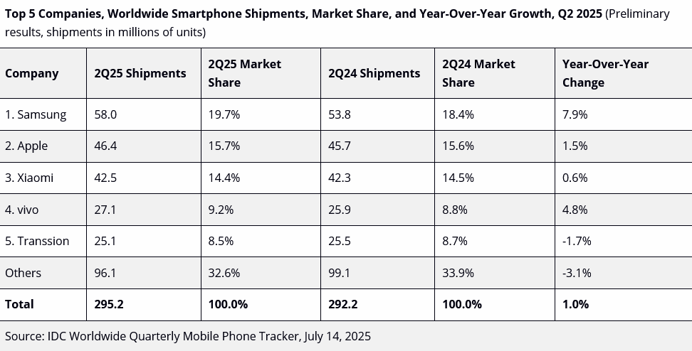 Samsung și-a menținut fotoliul de lider, la mare distanță de Apple, iar Xiaomi ocupă locul al 3-lea. În top 5 a intrat și Transsion cu brandurile sale ajune și la nivel local (Infinix). Dacă topul ar fi făcut după valoarea produselor vândute, Apple și-ar acontat prima poziție fără drept de apel.