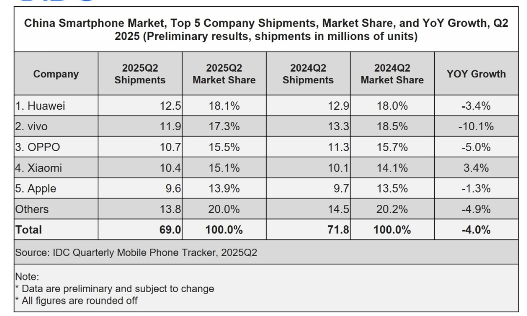 Vânzările și cota de piață sunt raportate la perioada de timp similară din 2024. Analiza IDC este valabilă pentru 1 aprilie 2025 – 30 iunie 2025 și se referă la numărul de unități livrate în piața chineză.