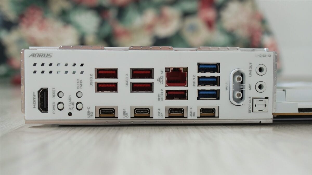 Aici, din nou GIGABYTE X870E AORUS PRO X3D ICE stă foarte bine. Pe panoul spate sunt extrem de multe porturi fizice, dintre cele mai recente și mai performante, cu două USB-C 4 cu viteze maxime de transfer de până la 40 Gbps și un port Ethernet RJ-45 care suportă viteze maxime de 5 Gbps. Excelent, dacă mă întrebați pe mine. Sunt extrem de multe porturi disponibile, pe care le-am trecut în tabelul cu specificații, aici mai amintesc de modulul Qualcomm QCNCM865 cu suport Wi-Fi 7 de tip tri-band și care integrează și conexiunea Bluetooth 5.4.