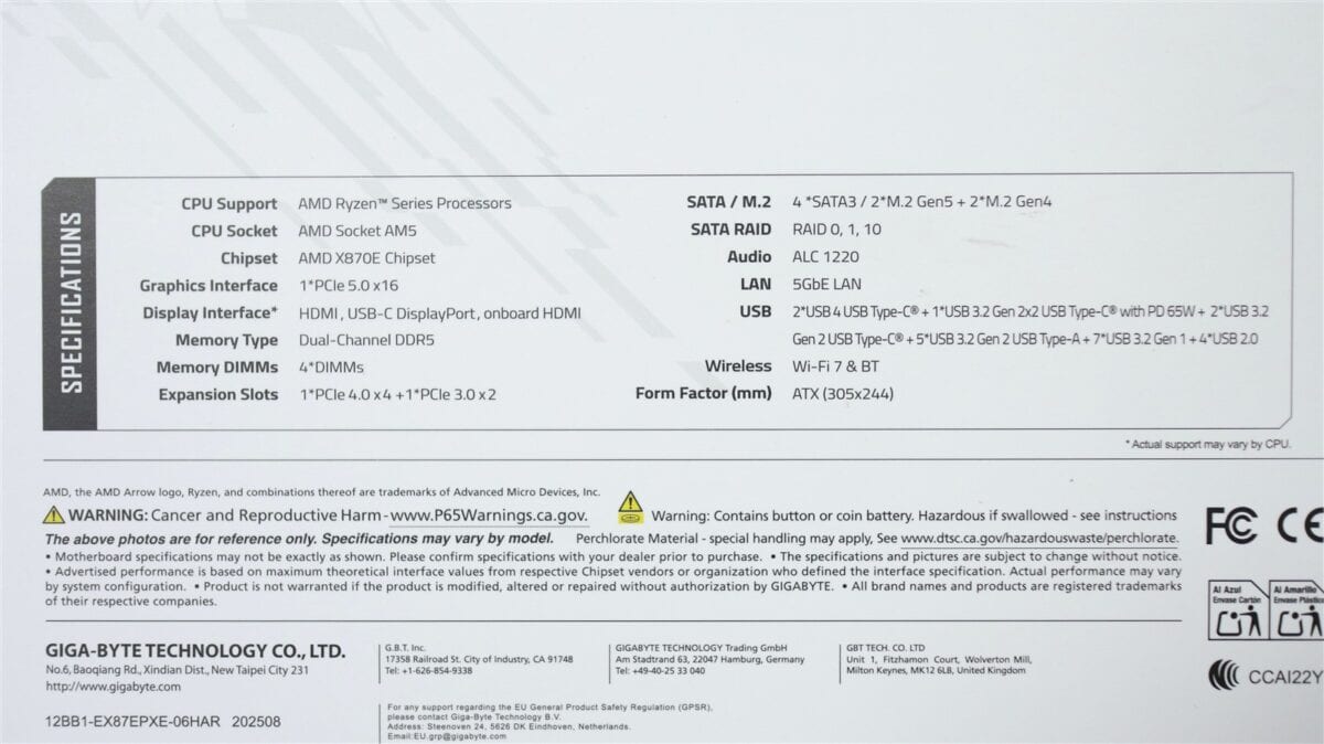 Specificații detaliate placă de bază GIGABYTE X870E AORUS PRO X3D ICE