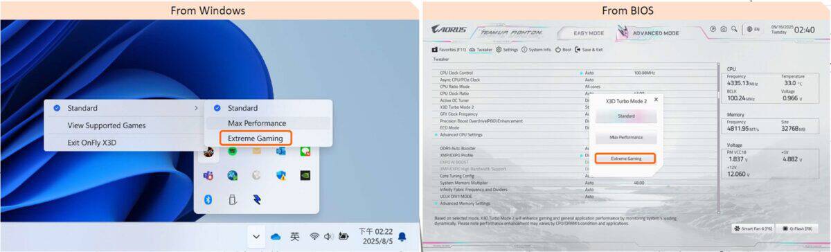 Utilizatorii au la dispoziție două profiluri principale de optimizare, care pot fi activate fie direct din BIOS (versiunea F4 sau mai nouă), fie din Windows prin utilitarul dedicat GIGABYTE OnFly X3D, așa cum putem vedea din imaginile de mai jos: