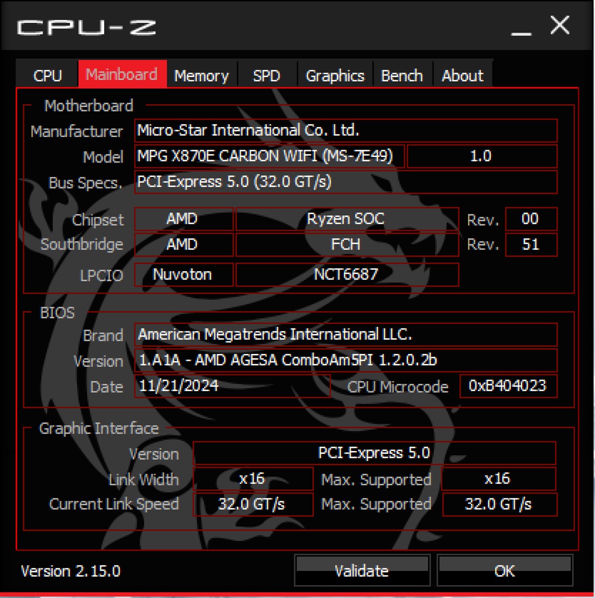 Înainte de a vedea rezultate din teste de benchmark și jocuri pe care le-am rulat pe sistemul de test, pentru a vedea cum se descurcă atât procesorul AMD Ryzen 7 9800X3D, cât și placa video SAPPHIRE Pure AMD Radeon RX 9070 16GB, avem mai jos capturi de ecran din CPU-Z, din care reiese configurația sistemului de test.