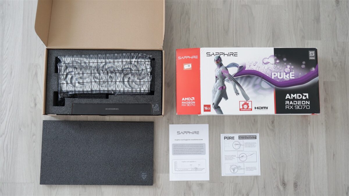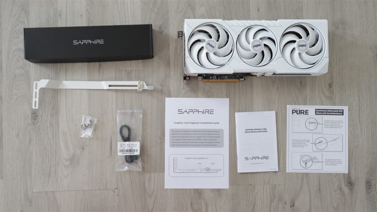 În ceea ce privește partea de GPU, avem mai multe de discutat, din fericire. La mine, placa video SAPPHIRE Pure AMD Radeon RX 9070 16GB a ajuns în cutia de retail, în care mai găsim un suport de tip L, șuruburi pentru fixarea acestuia, un cablu pentru iluminarea ARGB și trei pliante, cu diferite informații.