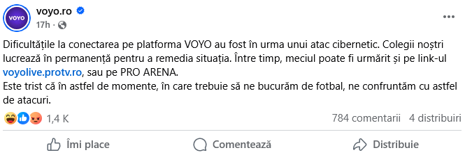 Oficialii Pro TV au declarat că platforma de streaming video Voyo a fost supusă unui atac cibernetic şi că de aici problemele. În online se sugerează însă că vorbim de o subdimensionare tehnică, foarte mulţi abonându-se pentru acest meci de fotbal.
