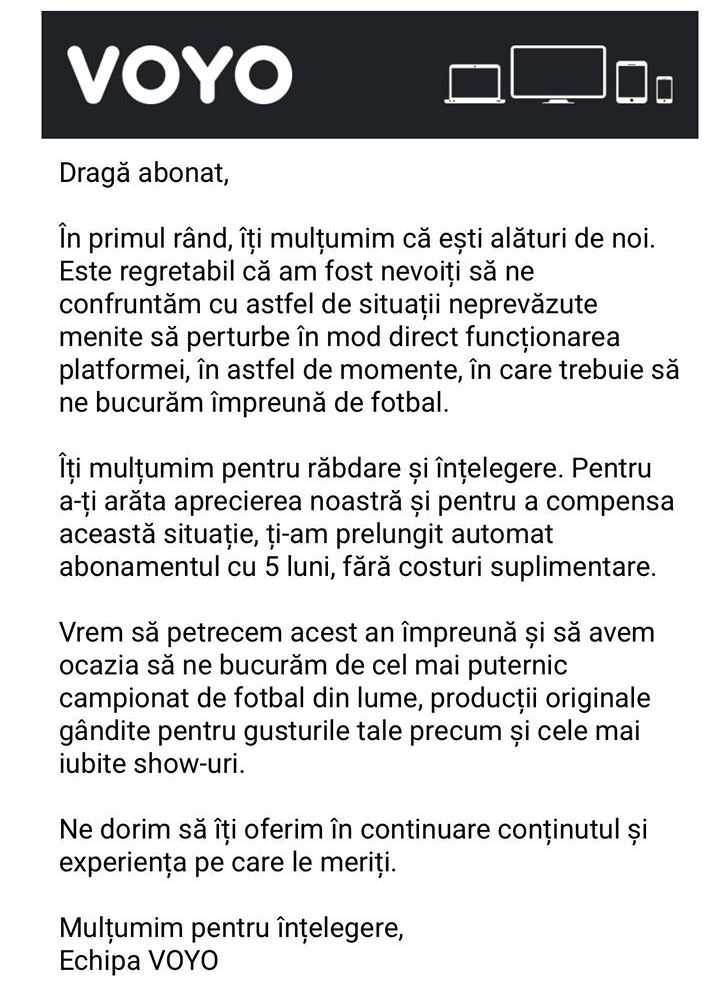 Update: conform celor de la golazo.ro, oficialii Pro TV au decis ca toţi abonaţii Voyo să primească o prelungire automată şi gratuită a abonamentului cu încă 5 luni drept compensaţie pentru situaţia de la meciul Drita – FCSB.