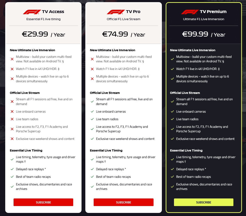 - TV Access – 29.99 euro / an (acest abonament oferă acces doar la reluări şi la anumite informaţii tehnice);