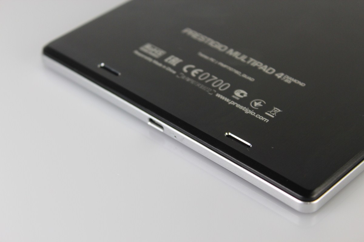 Spatele lui Multipad 4 Diamond 7.85 este fabricat dintr-un plastic de foartă bună calitate, mat și nu adună amprentele într-un mod deranjant. În anumite situații de utilizare merge a fi folosită și cu o singură mână. Logo-ul Prestigio nu-l regăsiți în partea frontală ci doar pe spatele tabletei. Marginile ecranului sunt ceva mai reduse pe lateral, față de alte tablete concurente. Ecranul este înconjurat de margini negre, lucioase.
