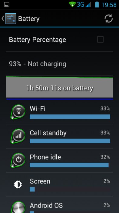 Bateria de 1500 mAh este pusă la lucru de display-ul de 4.5 inch, de cele două cartele SIM, de procesorul MediaTek dual-core. Se descurcă destul de ok. Mă așteptam la rezultate mai slabe. Cu luminozitatea pe 50%, fără sincronizări în fundal, apeluri și mesaje text, gaming spre zero și se duce spre o zi de autonomie.