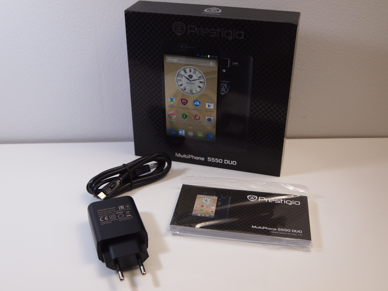 Prestigio MultiPhone 5550 DUO este disponibil pe piață în trei culori distincte pentru carcasă: Albastru (Navy Blue), Gri (Gunmetal) și Negru (Graphite Black). Nouă ne-a ajuns la test ultima variantă, iar alături de smartphone-ul propriu-zis, în cutie mai găsim bateria de 3000 mAh, cablul microUSB – USB 2.0, încărcătorul, manuale de utilizare și certificat de garanție internațională.