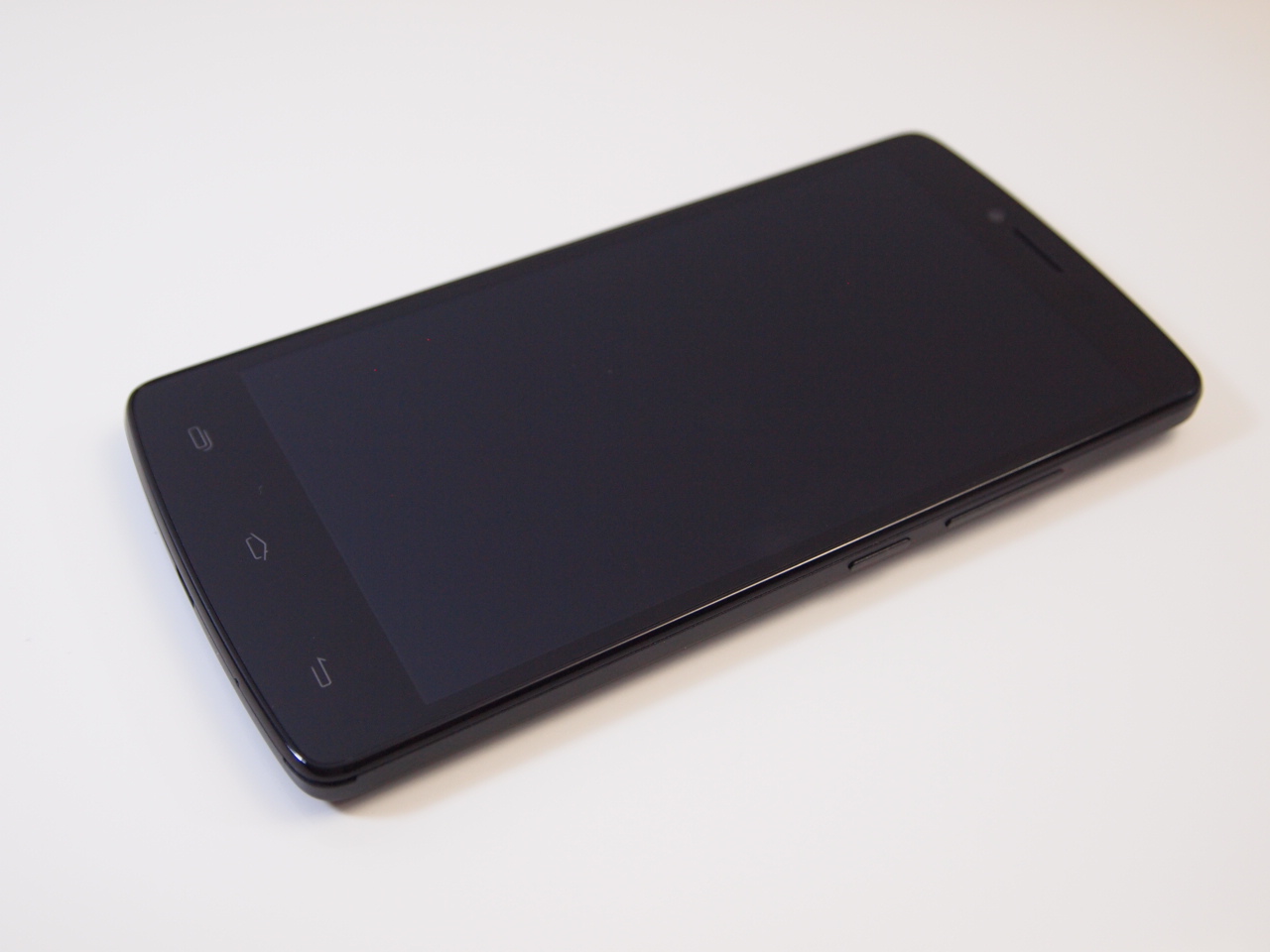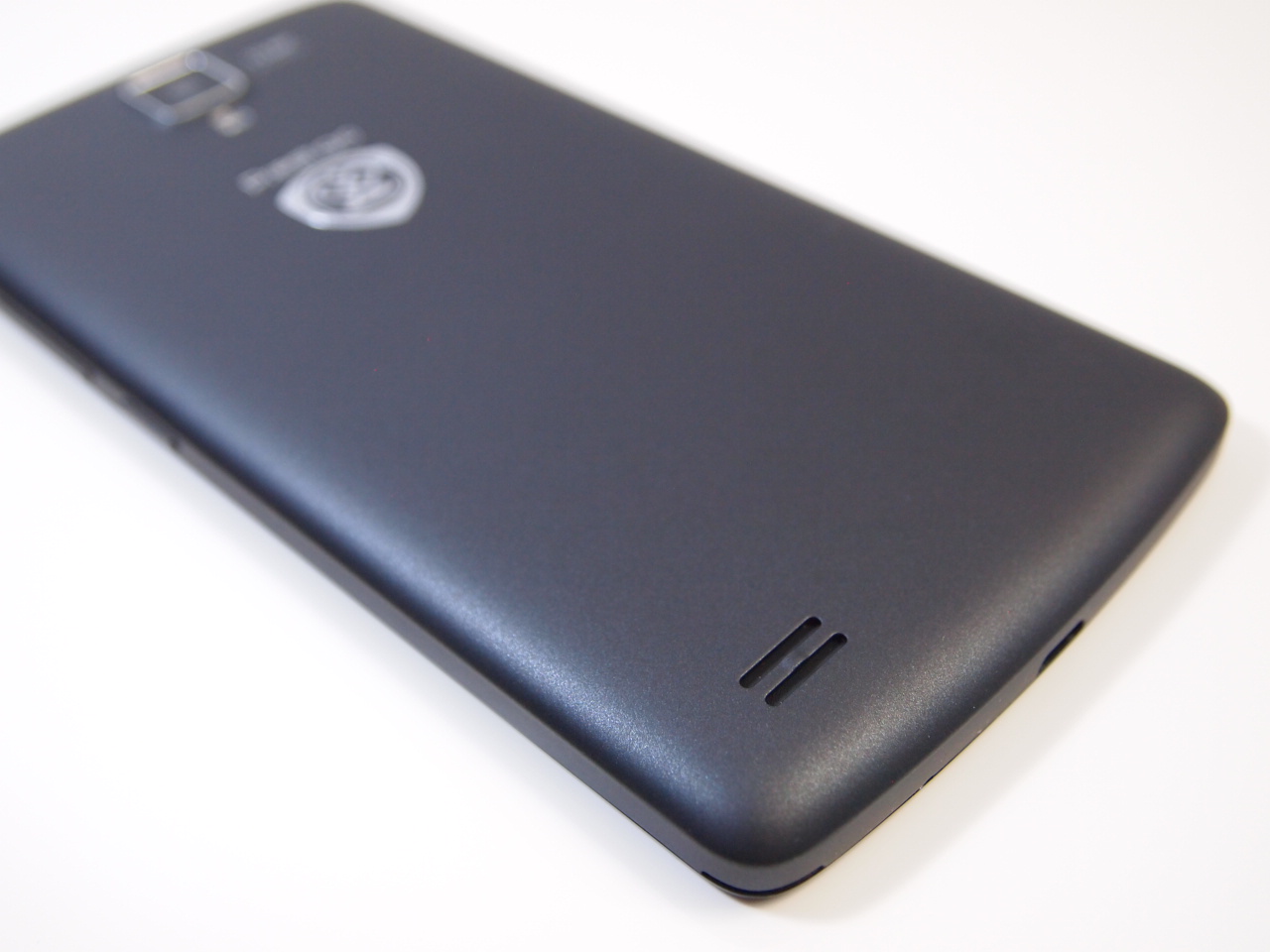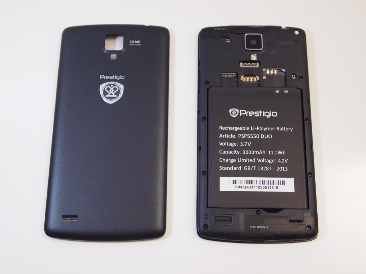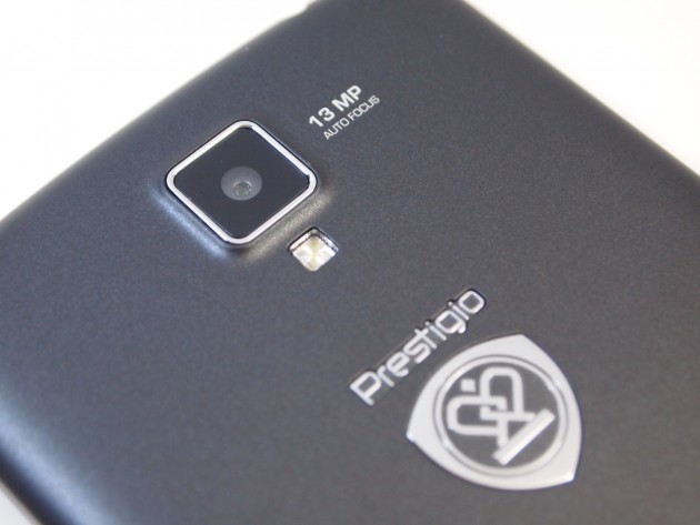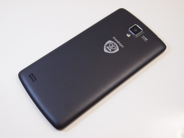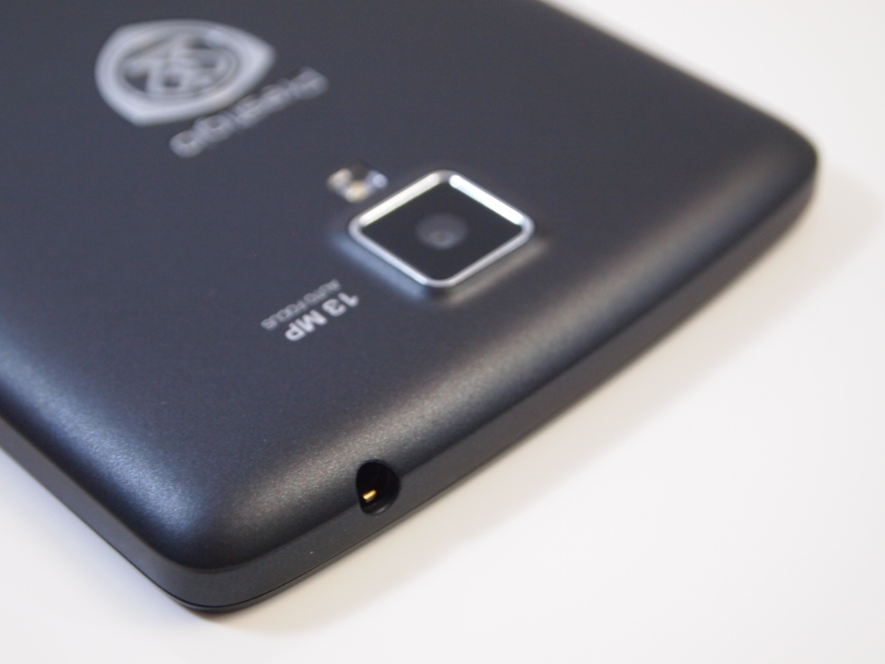 Ca aspect, Prestigio MultiPhone 5550 DUO nu pot să spun că iese cu ceva anume în evidență. Designul nu a reprezentat o prioritate, dar asta nu înseamnă că avem parte de un telefon urât. Pe partea din față nu avem niciun element care să iasă în evidență, sub ecran fiind cele trei taste capacitive cu rol de Back, Home și Options (de la dreapta la stânga), iar deasupra display-ului vedem grila difuzorului pentru apeluri și camera frontală în stânga acestuia. Spatele smartphone-ului adăpostește senzorul camerei foto de 13 Megapixeli, LED flash-ul, denumirea și logo-ul producătorului și grila speaker-ului extern.