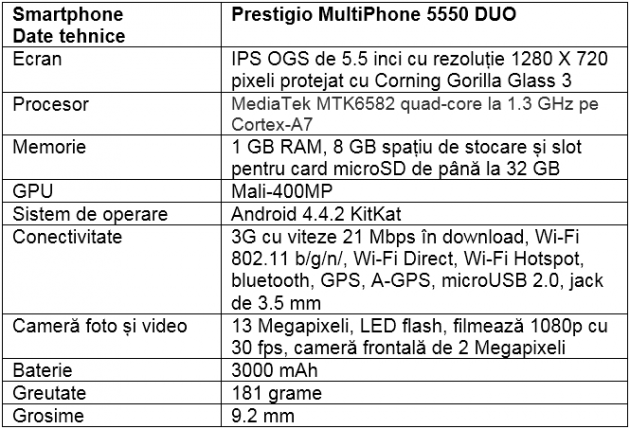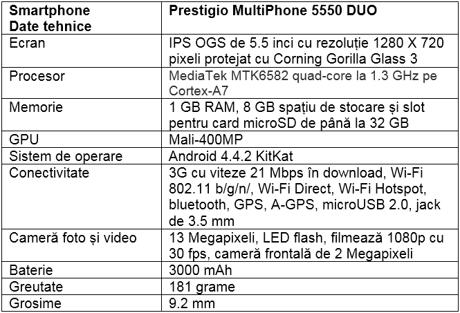 Din punct de vedere al specificațiilor hardware Prestigio MultiPhone 5550 DUO se prezintă la apel cu o soluție foarte des întâlnită în această categorie de preț. Procesorul MediaTek MT6582 quad-core la 1.3 GHz cu accelerator grafic Mali-400MP, 1 GB de RAM și 8 GB spațiu de stocare se dovedesc suficient de puternice pentru majoritatea situațiilor.