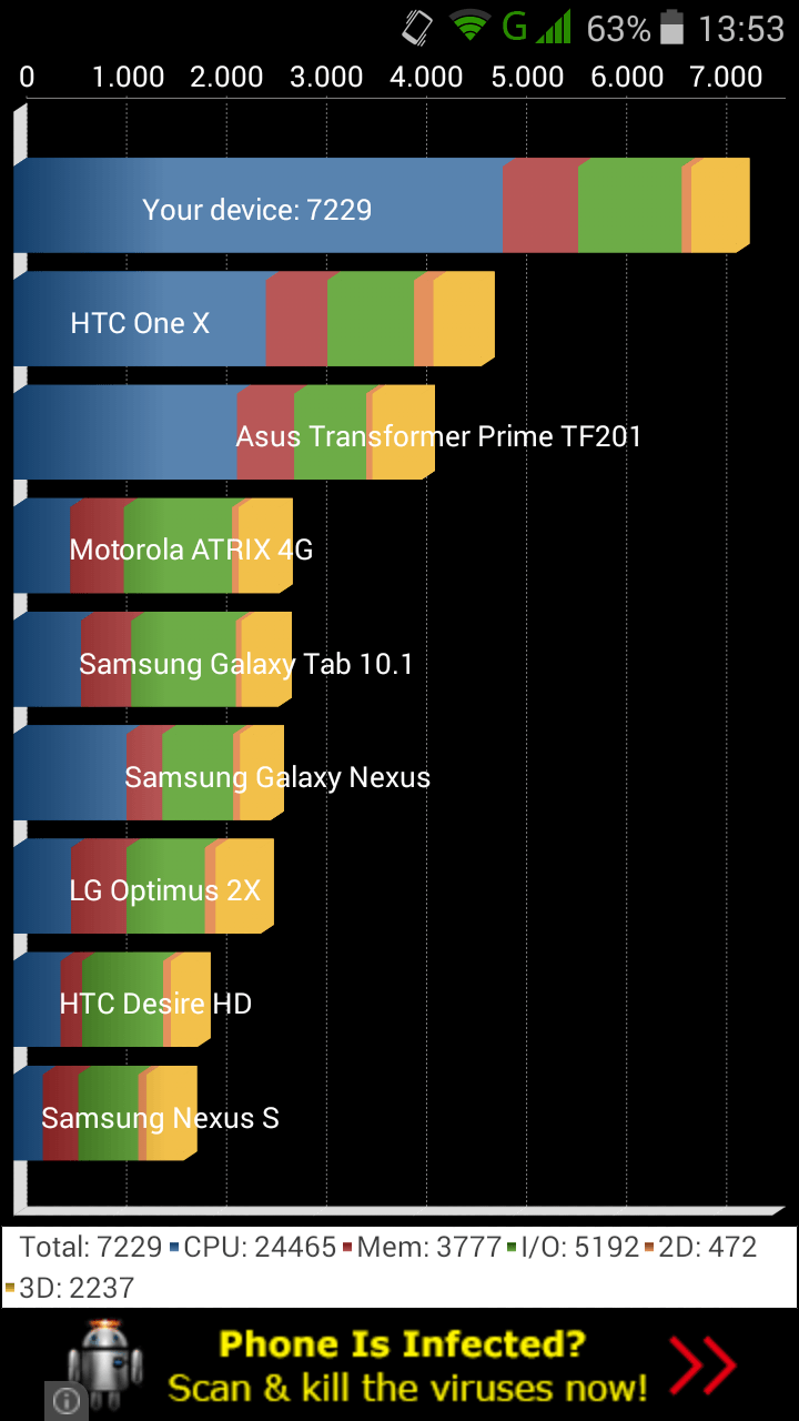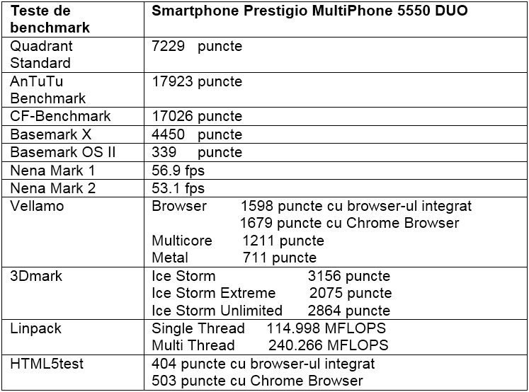 A trecut prin încercările testelor de benchmark și Prestigio MultiPhone 5550 DUO, iar rezultatele sunt grupate în tabelul de mai jos: