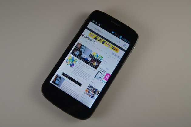 TFT de 5 inch cu rezoluție 480×800 pixeli și trei taste capacitive la bază. Poți să-ți faci treaba, se vede ok. Display-ul mare devine util pe partea de browsing, când vizionezi clipuri via YouTube sau filme. Singurul factor care-l trage în jos ar fi rezoluția. Touch-ul mi-a dat impresia că funcționează precis. Spre a vedea ceva pe display sub acțiunea razelor soarelui trebui să ai luminozitatea la maxim.