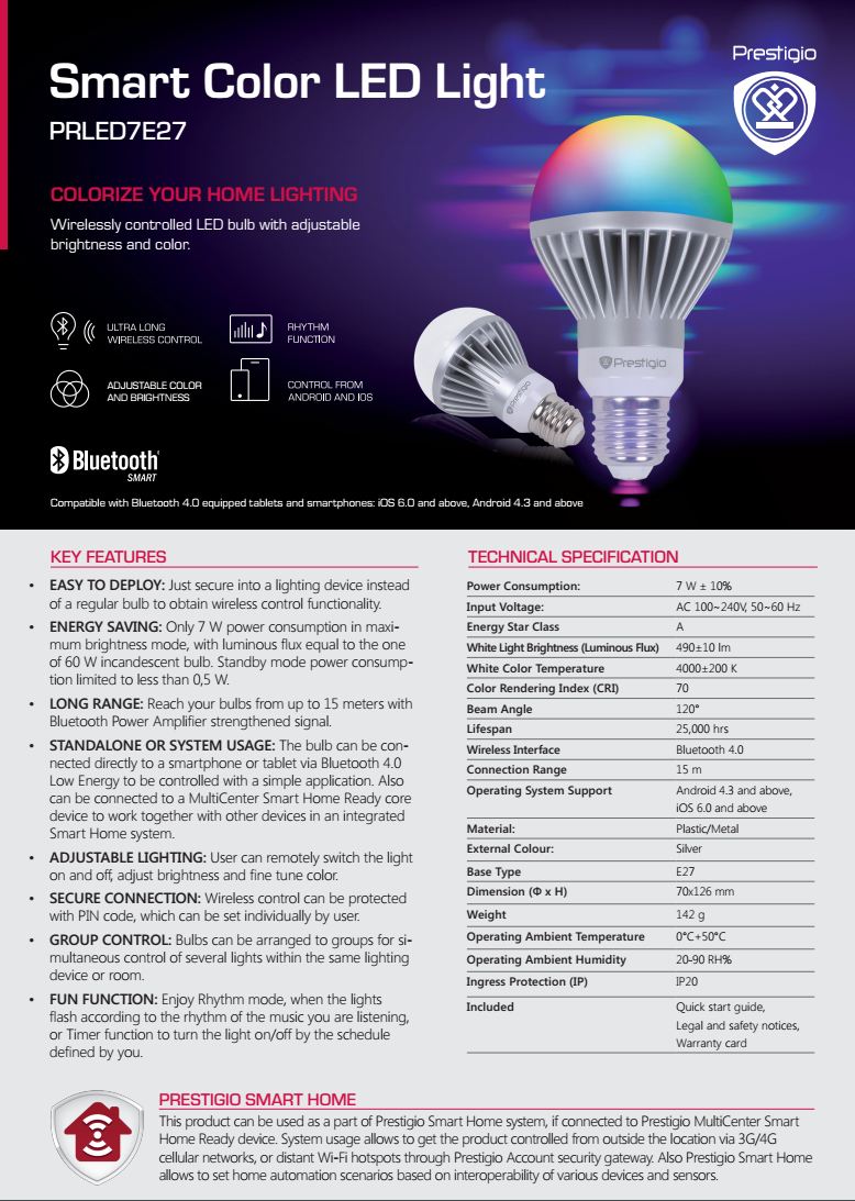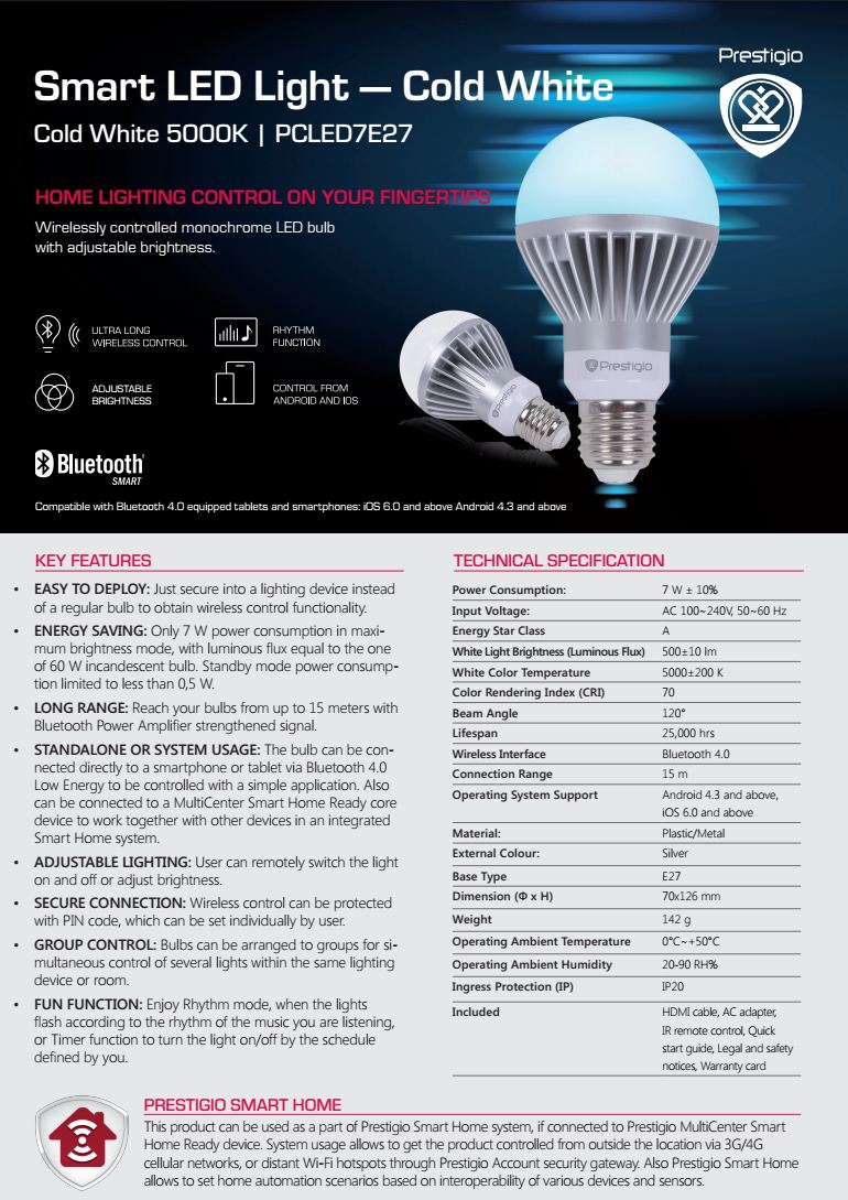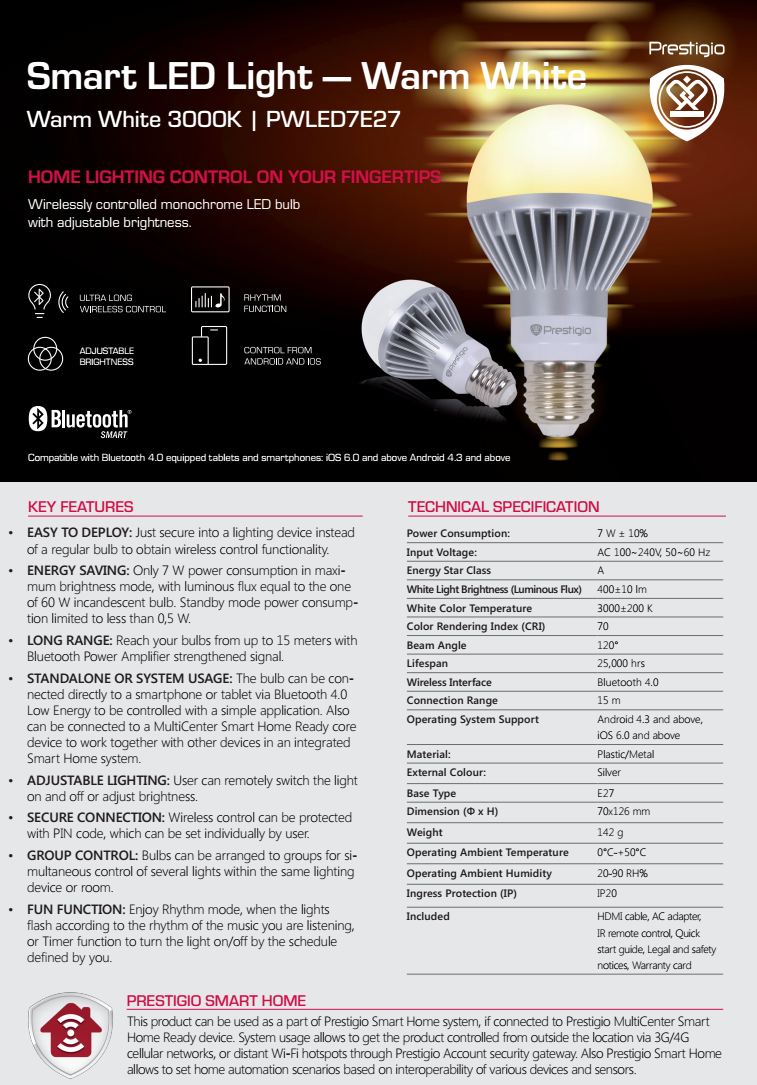 Ca putere sunt similare cu un bec incadescent de 60W, consum maxim de 7W și 0.5W în stand-by. Becurile sunt controlate wireless cu ajutorul unui smartphone sau tablete ce oferă conectivitate bluetooth 4.0 și trebuie instalată aplicația Prestigio Smart Home. Becurile LED pot fi organizate în grupuri și controlate simultan, merge a fi setată și o ritmicitate în funcție de muzica redată în cameră, modelul de top are o paletă de culori destul de largă și schimbarea culorilor se face printr-o aplicație dedicată.
