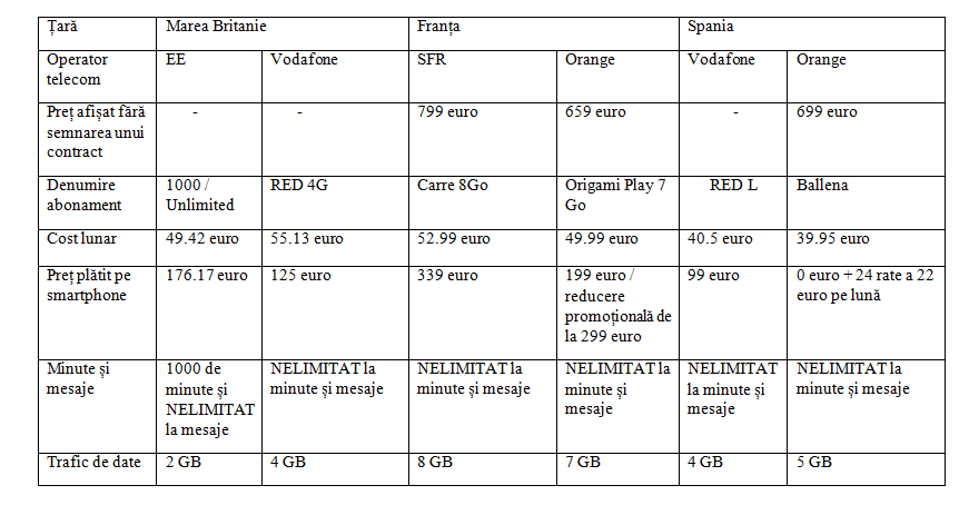 Am tras o privire prin oferta operatorilor din Marea Britanie, Franța și Spania, iar datele obținute sunt ordonate în tabel. Am ales costurile generate de iPhone 6 în varianta de bază cu 16 GB spațiu de stocare.