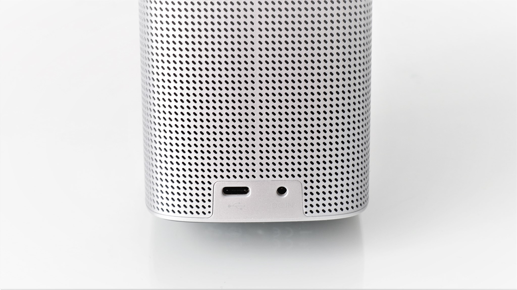 Partea inferioară a proiectorului este fabricată la exterior din metal, dintr-o grilă cu sute de orificii ovale, poziționate cumva pe diagonală. La bază, pe față vedem logo-ul BenQ, iar pe spate este portul USB Type-C și mufa de încărcare.