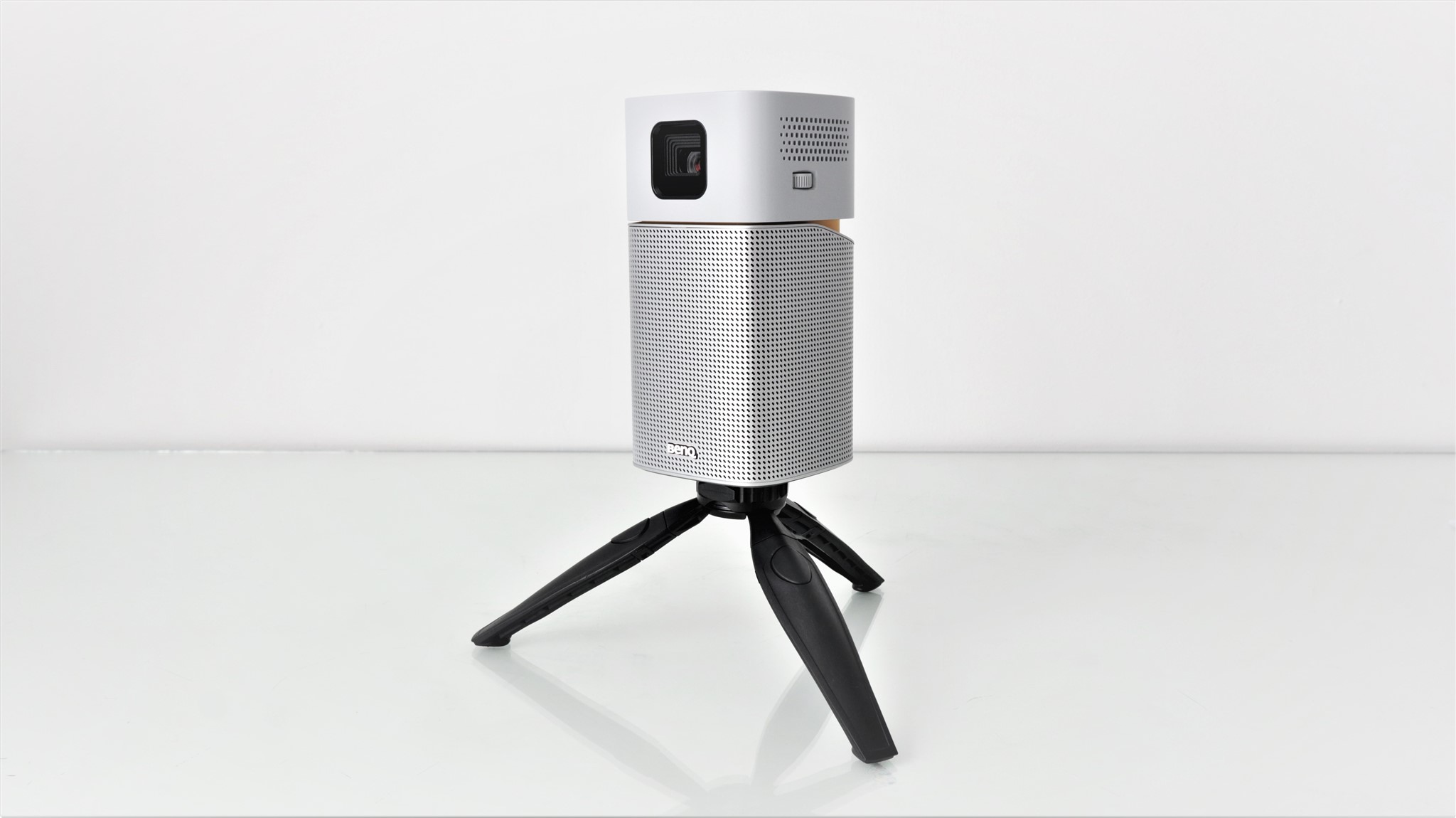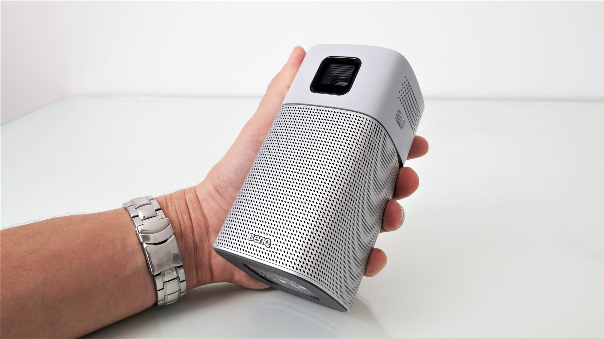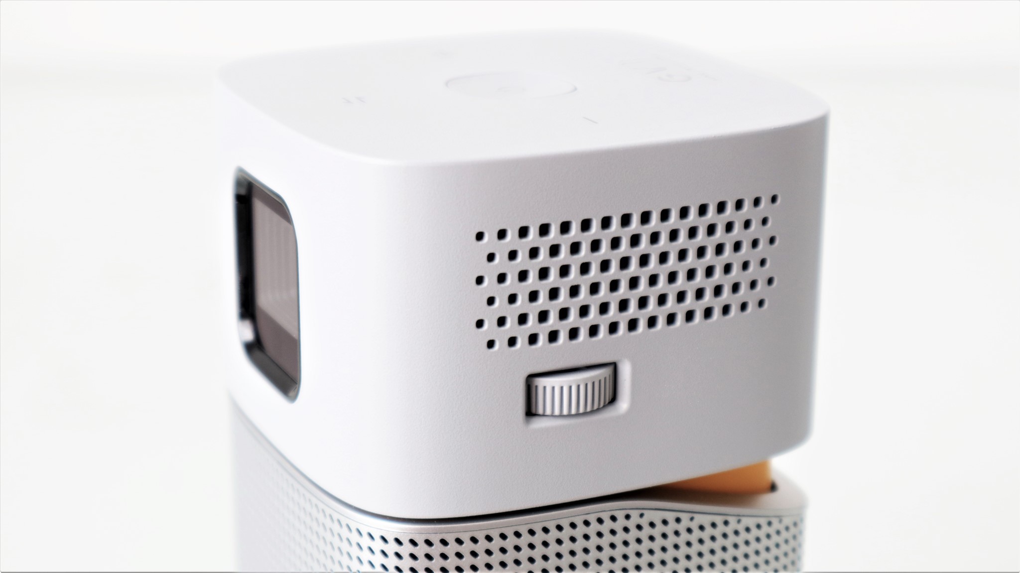 Partea superioară a proiectorului este fabricată din plastic mat, doar ușor rugos, plăcut la atingere. În zona frontală este poziționat sistemul de lentile, pe laterale sunt fante de aerisire, pe unde intră aerul către lampa de proiecție, în timp ce pe spate este fanta prin care este evacuat aerul cald de către ventilator. Pe laterala din stânga este și rotița de ajustare a focusului. Sus este butonul Power, ce integrează și un LED de status, dar și taste capacitive – două pentru reglarea volumului și una pentru modul Bluetooth.
