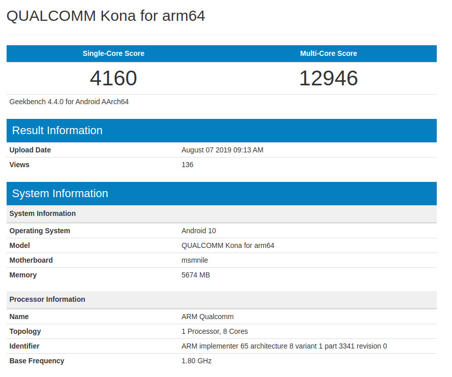Compania americană este şi anul acesta în grafic, Qualcomm Snapdragon 865 fiind deja în faza de testare (una incipientă foarte probabil). Un device prototip cu Qualcomm Snapdragon 865 versiunea Kona + 6 GB RAM + Android 10 Q în fază beta a apărut în rapoartele testului de benchmark GeekBench, iar rezultatele sunt foarte bune pentru această etapă (fiind la început, în următoarele luni se vor face multe optimizări care vor spori performanţele procesorului): 4160 puncte în Single-Core şi 12.946 puncte în Multi-Core.