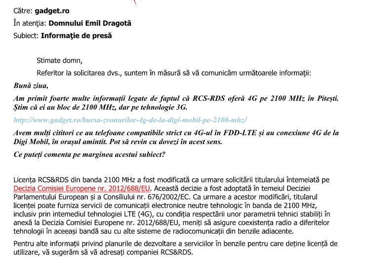 „Licența RCS&RDS din banda 2100 MHz a fost modificată ca urmare solicitării titularului întemeiată pe Decizia Comisiei Europene nr. 2012/688/EU. Această decizie a fost adoptată în temeiul Deciziei Parlamentului European și a Consiliului nr. 676/2002/EC. Ca urmare a acestor modificări, titularul licenței poate furniza servicii de comunicații electronice neutre tehnologic în banda de 2100 MHz, inclusiv prin intemediul tehnologiei LTE (4G)„