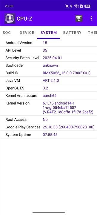 Capturi din CPU-Z cu informații despre realme 14 Pro: