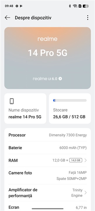Aici, inima ansamblului hardware este reprezentată de chipset-ul MediaTek Dimensity 7300 Energy, realizat pe 4nm. Este aproape la același nivel cu procesorul fratelui ce deține și particula „+” în denumire, deci din acest considerent nu faci o alegerea rea cu realme 14 Pro. Celelalte caracteristici hardware sunt trecute în tabelul cu specificații, deci nu le mai repet aici.
