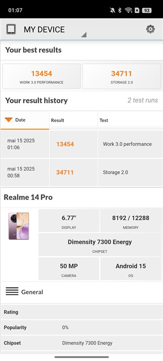 Pentru a putea face o comparație cât mai ușor de urmărit între cum se descurcă realme 14 Pro față de fratele cu „+”, am așezat unele lângă celelalte rezultatele din testele de benchmark rulate de ambele.