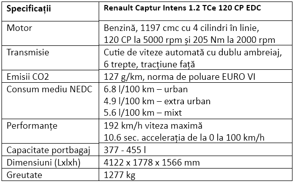 Specificații pentru Renault Captur Intens 1.2 TCe 120 CP EDC