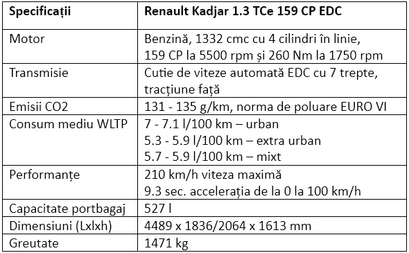 Specificații pentru Renault Kadjar 1.3 TCe 159 CP EDC