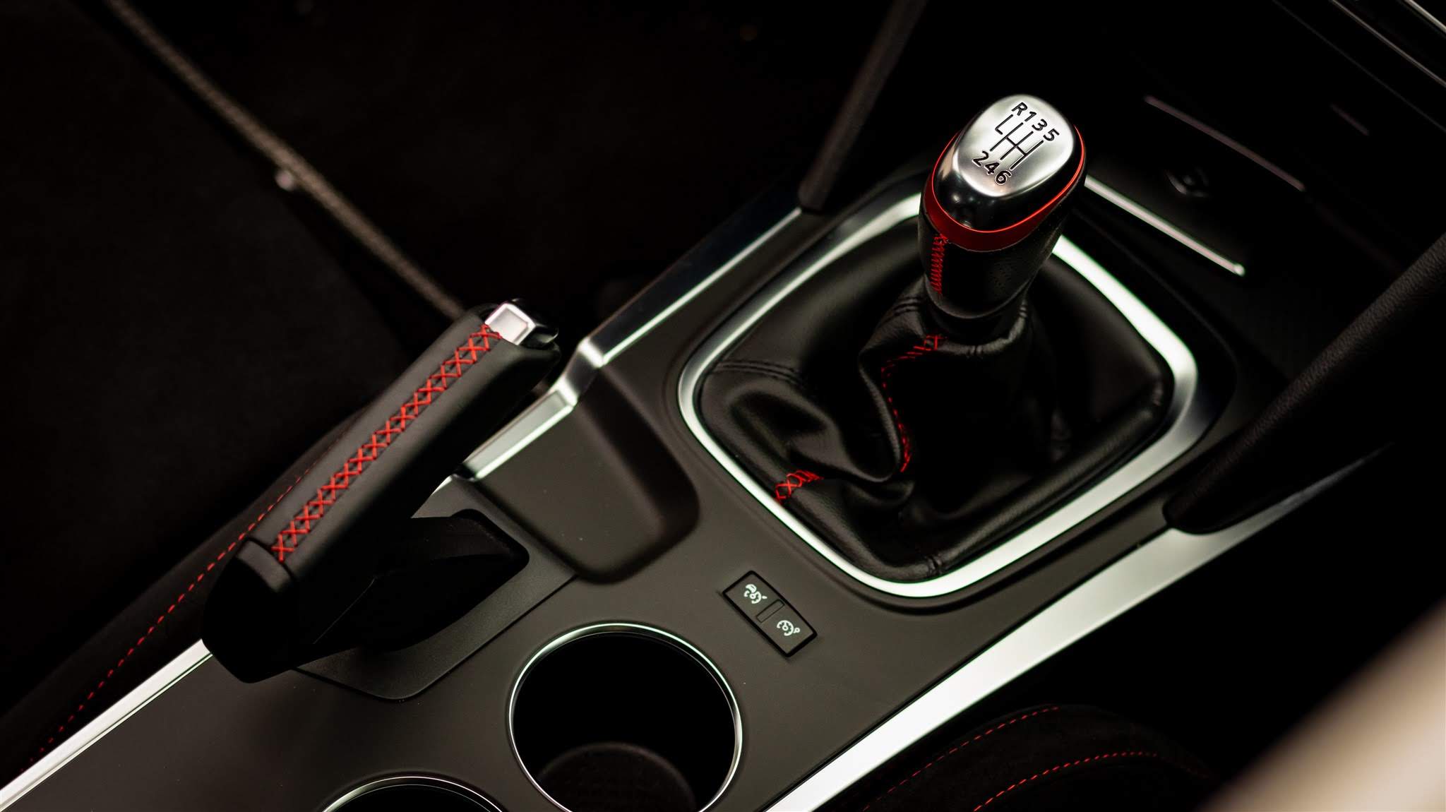 Frâna de mână este la Megane RS una clasică și nu una electrică. Pe fețele de uși avem un material textil ce imită fibra de carbon și care se simte grozav la atingere. Pe bord vedem o fâșie ce imită și ea același material ultra-ușor, pe care stă scrisă și divizia ce s-a ocupat de această mașină. Denumirea Renault Sport este și pe pragurile interioare, iar logo-ul acestei divizii mai este pe scaune și pe volan într-o nuanță de roșu aprins ce vrea să te pună în temă că nu ai de-a face cu orice Megane.