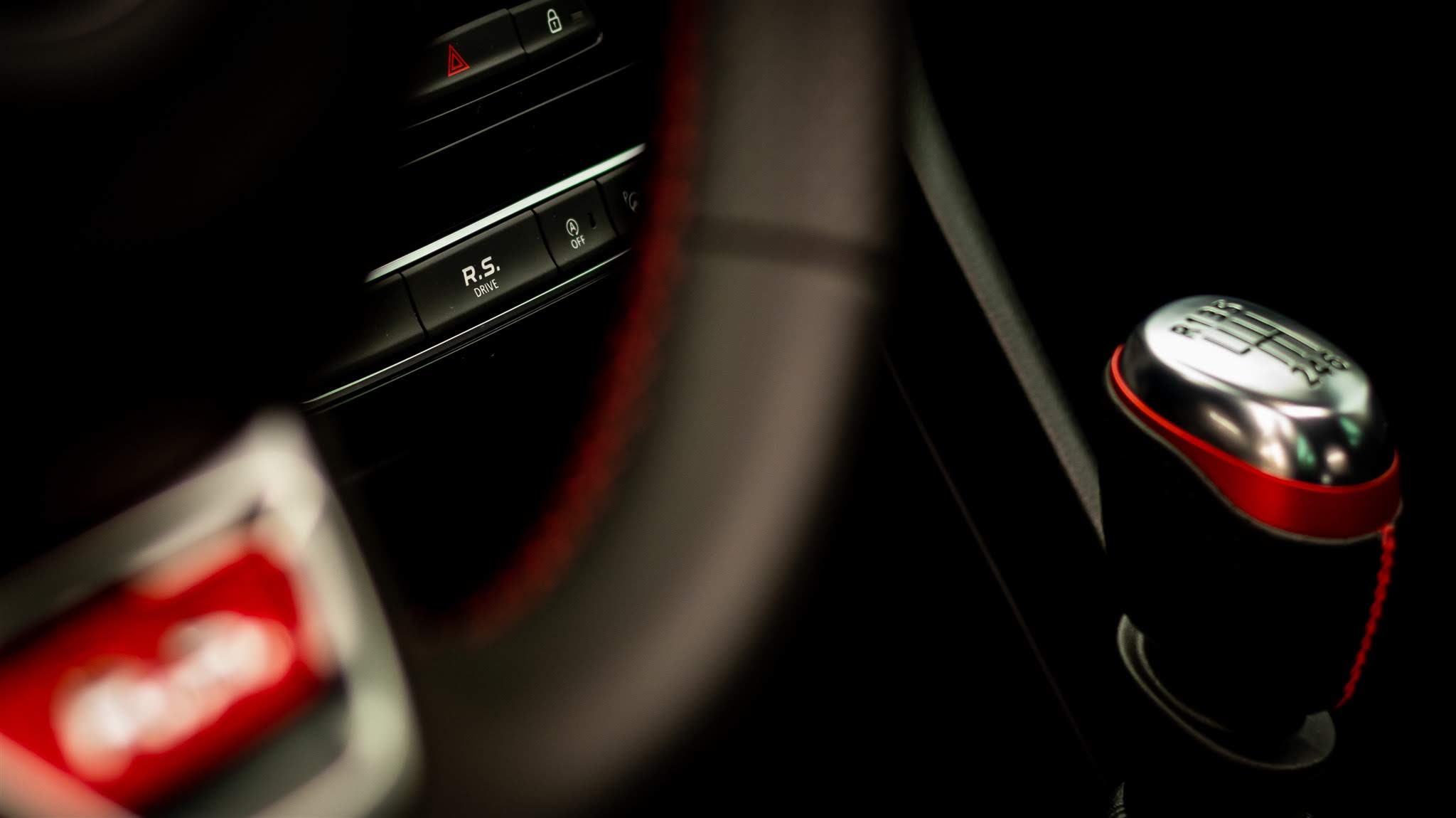 Înăuntru ai parte de cel puțin la fel de multe accesorii de individualizare. De la excelentele scaune Recaro îmbrăcate în Alcantara, ce sunt montate cu 20 de mm mai jos față de un RS standard, la volanul gros, cu piele perforată în dreptul mâinilor și bandă roșie la poziția de centru, până la schimbătorul de viteze cu măciulie de aluminiu și pedalele din același material, toate elementele cu care interacționează șoferul au fost personalizate.