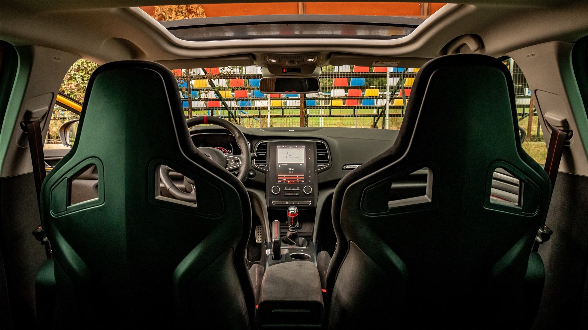 Acum o să mă axez pe ceea ce contează. Poziția la volan este excelentă, scaunele montate mai jos cu 2 cm față de Megane RS de bază te introduc într-o atmosferă de curse. Sprijinul lateral este absolut genial, buretele este tare, dar, cu toate astea, nu am găsit scaunele incomode. Nici după o zi întreagă de condus nu m-au deranjat. M-a obosit altceva, dar o să descoperiți mai departe exact ce anume.