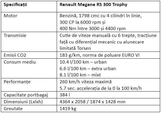Renault Megane RS 300 Trophy – de la 34.050 euro cu TVA. O mașină complet echipată, cu toate opționalele, precum cea testată, ajunge la 41.150 de Euro.