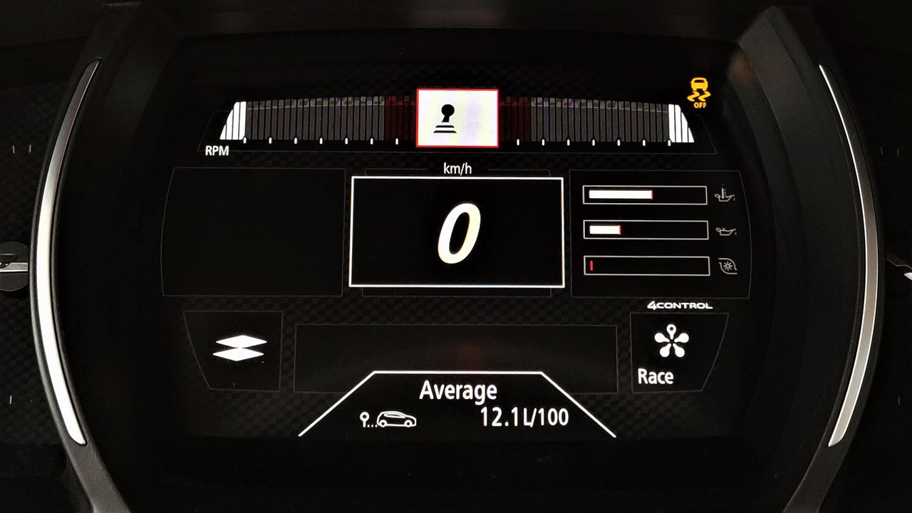 Aș menționa aici afișajul digital de bord, ce folosește același ecran de 7 inch precum am întâlnit și la Kadjar, Talisman și chiar Megane Sedan, dar care introduce un mod mai special de afișaj. Treci în Race din R.S. Drive și ai parte de panoul de bord ce pare de curse. L-am văzut și la Megane GT, dar parcă aici se potrivește mult mai bine.