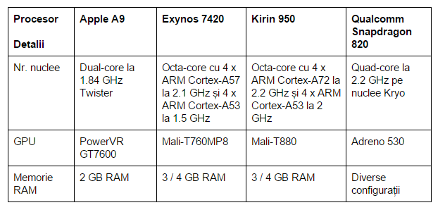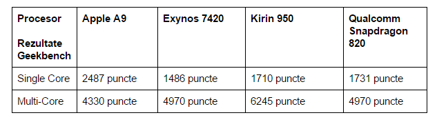 În tabel puteți vedea rezultatele obținute de Apple A9, Exynos 7420, Kirin 950 și Qualcomm Snapdragon 820.
