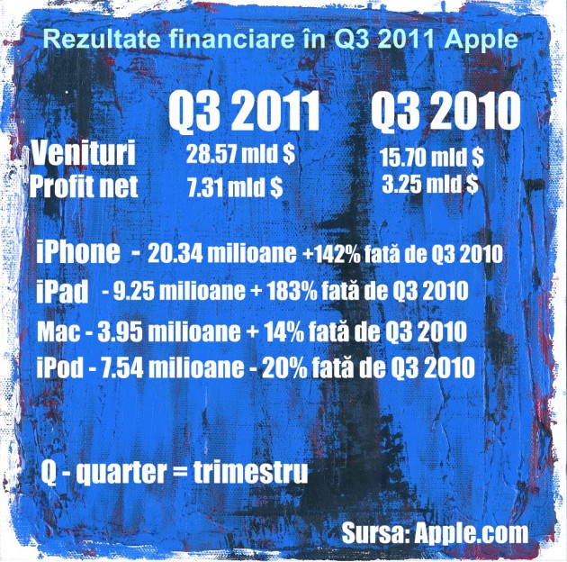 Un alt trimestru se încheie cu beneficii de amploare pentru Apple. Îmi aduc aminte că unele studii indicau compania americană pe primul loc în lume ca brand. iPhone și iPad au jucat un rol crucial în dezvoltarea din ultimii doi ani. O sumă de cifre reunite mai jos reliefează dezvoltarea fără precedent.
