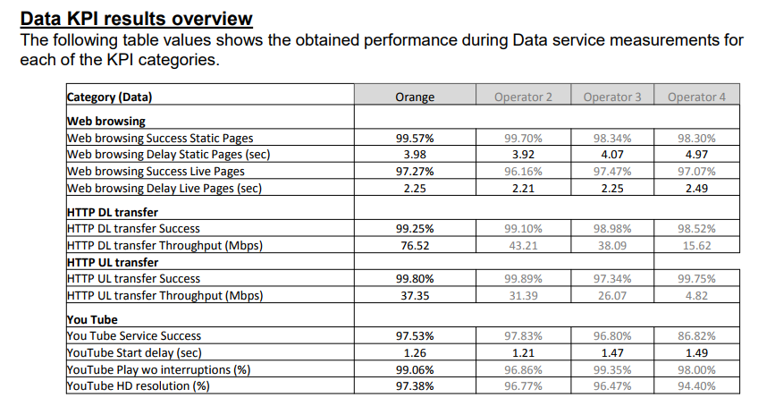Aș spune că și pe partea de Date Mobile nu sunt diferențe uriașe, mai ales între pozițiile 1 și 2. Observați că Operatorul 2 depășește Orange pe web browsing, upload de fișiere http și YouTube (diferențe foarte mici), dar iese în față pe download de fișiere http etc.