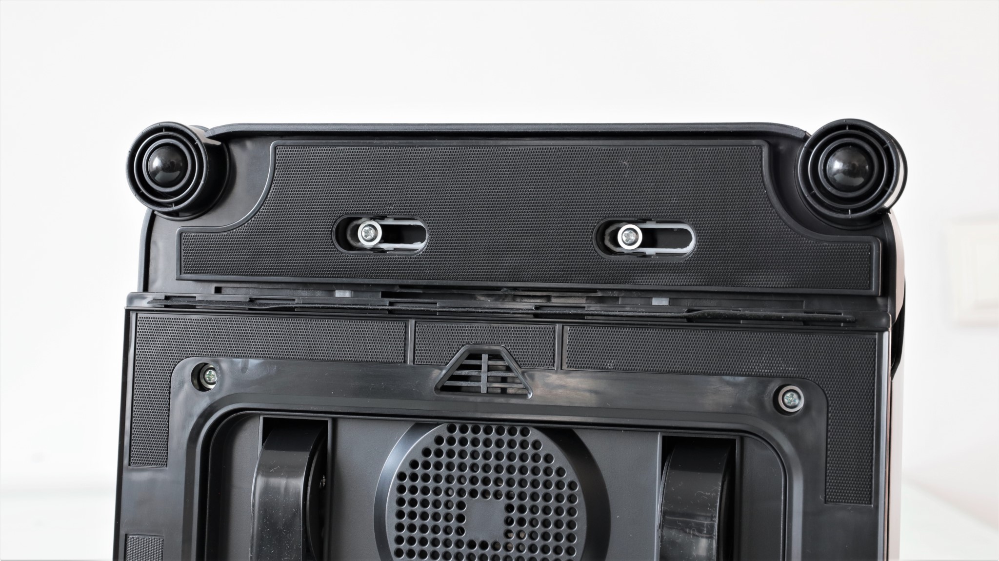 Pe partea interioară a robotului observi în centru grila în spatele căreia este ventilatorul ce asigură fixarea prin vid pe geam, iar în apropierea acestuia este butonul de tip slider On/Off și LED-ul de status, care, la fel ca cel de pe partea superioară, poate lumina în roșu sau albastru. Acest LED este folositor atunci când robotul curăță geamurile din afara locuinței și practic tu vezi partea interioară a dispozitivului.