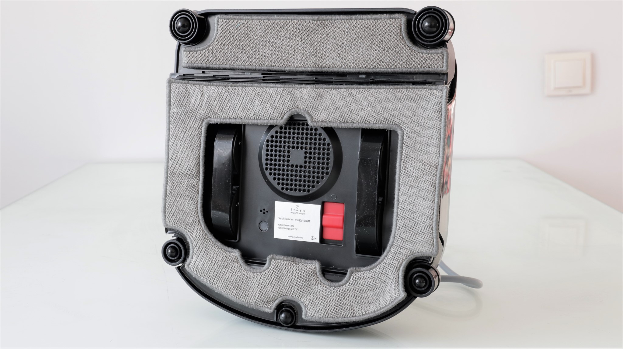 În jurul ventilatorului ce creează vid este o bordură de cauciuc. Tot în interiorul acesteia sunt și cele două șine din cauciuc, ce-i permit deplasarea robotului pe suprafețele vitrate. Mai departe de acestea, este una dintre suprafețele velcro pe care se atașează una dintre lavete, cea de dimensiuni mai mari. Aceasta este cea care rămâne fixă în timpul operării.