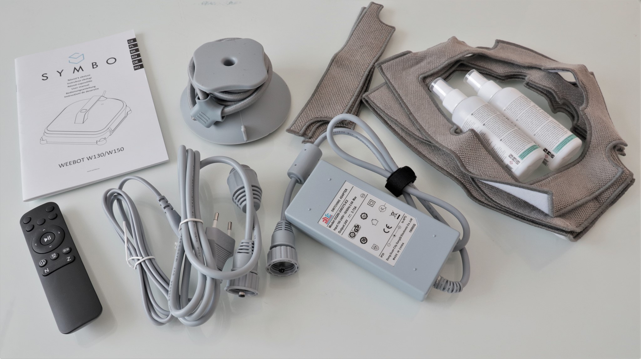 Am primit produsul în cutia de retail sigilată. Înăuntru, pe lângă robot, mai găsim telecomanda, cablul de alimetare, adaptorul de alimentare, un cablu prelungitor de alimentare, un șnur elastic de asigurare, ventuză pentru șnurul de asigurare, două seturi a câte trei lavete, două sticluțe tip spray cu soluție curățare și manual de utilizare:
