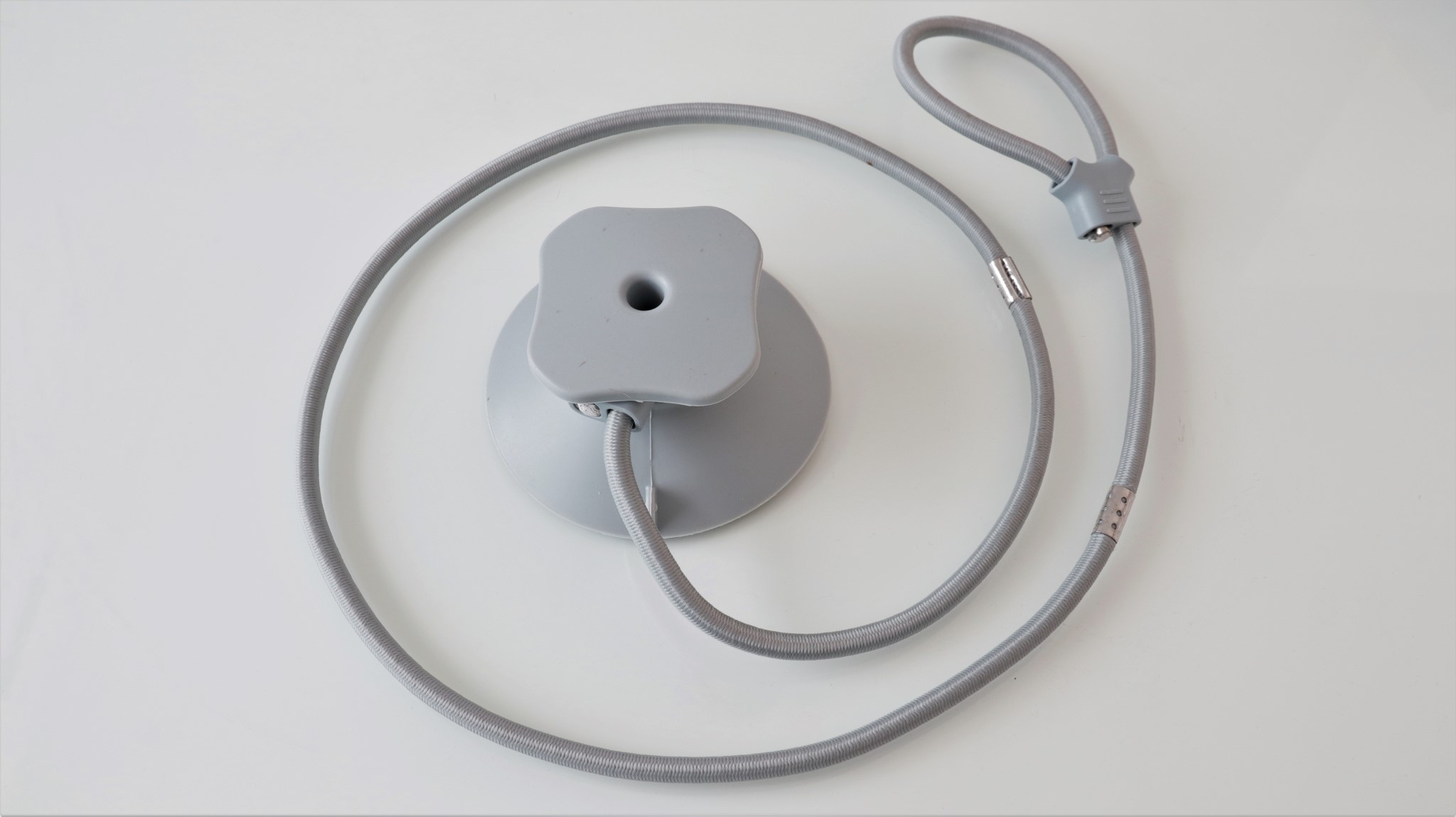 Pentru a asigura robotul atunci când funcționează, în cutie găsim și o ventuză cu un șnur elastic. În manualul de utilizare îți este arătat cum să asiguri robotul cu acest șnur și cu ventuza, pe unde să treci cablul de alimentare pentru ca la o eventuală problemă de funcționare robotul să nu poată cădea, ci să rămână atârnat în șnurul de asigurare.