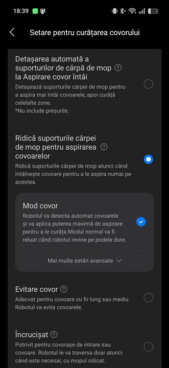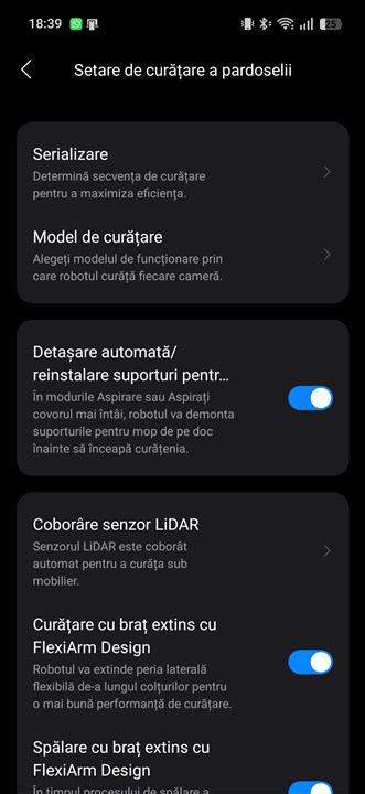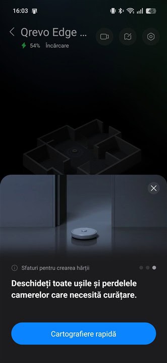 Apoi, am descoperit o aplicație cu o interfață modernă și foarte bine structurată. Ai parte de cele mai importante și folosite setări și meniuri chiar din pagina produsului, să-i spunem, cu unele funcții explicate și reprezentate chiar prin imagini sugestive, iar dacă vrei să mergi către setări mai complexe, să descoperi toate funcțiile pe care Roborock Qrevo Edge 2 Pro ți le poate pune la dispoziție mai există câteva meniuri separate. Dar nici acolo nu este nimic complicat, din nou totul este structurat logic și există explicații despre ce înseamnă majoritatea funcțiilor și setărilor.