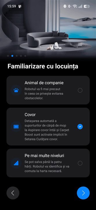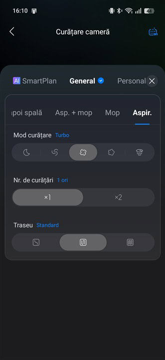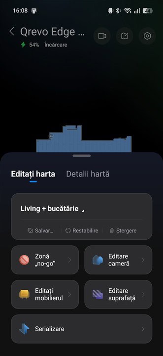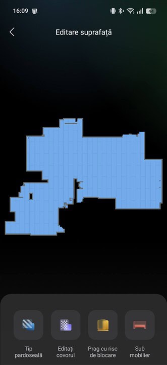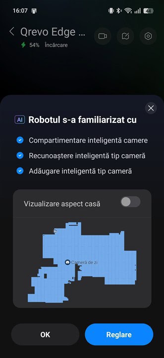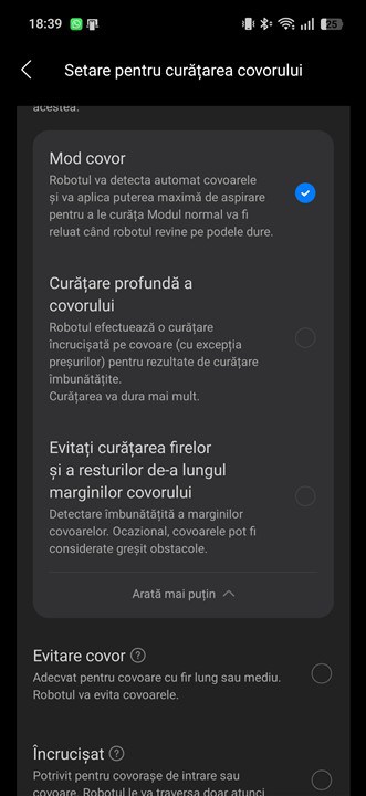 Mi-a plăcut că Roborock Qrevo Edge 2 Pro determină exact unde este parchet și unde este covor și reacționează în consecință, reglând puterea de aspirare în conformitate cu tipul suprafeței. Dar nu numai atât, determină inclusiv tipul de covor / mochetă, adică dacă are fire scurte sau mai înalte, dacă sunt mai dese ori mai rare și, la fel, reglează totul (puterea de aspirare și turația periilor) așa cum trebuie, cum este necesar în fiecare caz.