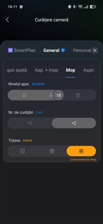Din aplicație poți alege nivelul de umezire a mopurilor, poți alege dacă spălarea să fie una standard sau intensă, precum și numărul de treceri – una singură sau dublă, cu două treceri perpendiculare ca sens una față de cealaltă. Am ales un mod de spălare foarte intens, cu o umezire la treapta 20 din maxim 30 posibil, cu 2 treceri și traseu intens. Spălarea a fost foarte eficientă, totul a rămas cu adevărat curat, fără pete sau orice alte urme lăsate. Trebuie precizat că pe timpul acestei spălări, Roborock Qrevo Edge 2 Pro a revenit de două ori la bază spre a spăla mopurile.