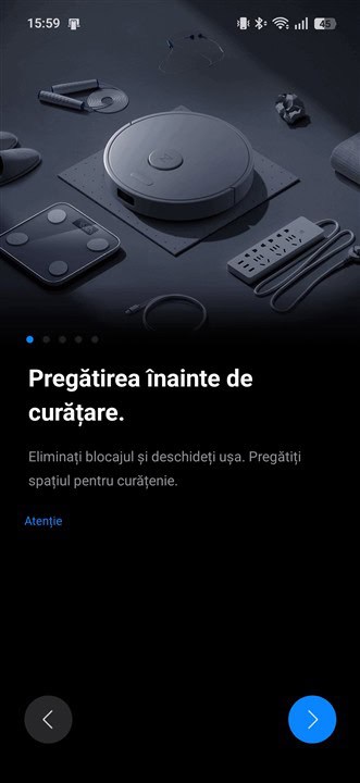 Pentru a conecta robotul la rețeaua de internet de acasă și spre a putea apoi controla toate funcțiile, este necesar să instalezi aplicația Roborock, disponibilă gratuit atât în Google Play Store, cât și în Apple AppStore. Eu am folosit prima opțiune și de la instalare până ce am putut parcurge meniul de opțiuni au trecut maxim 5 minute, cu tot cu înregistrare / logare în contul de Roborock.