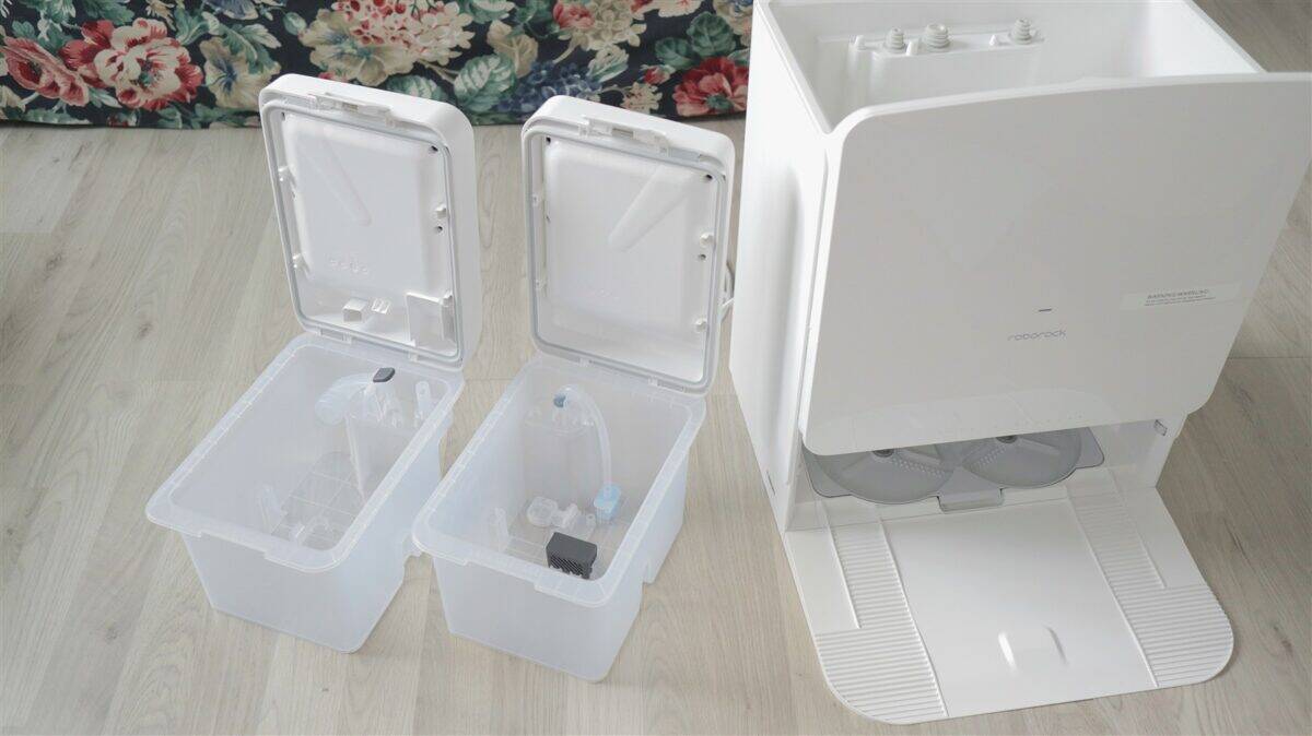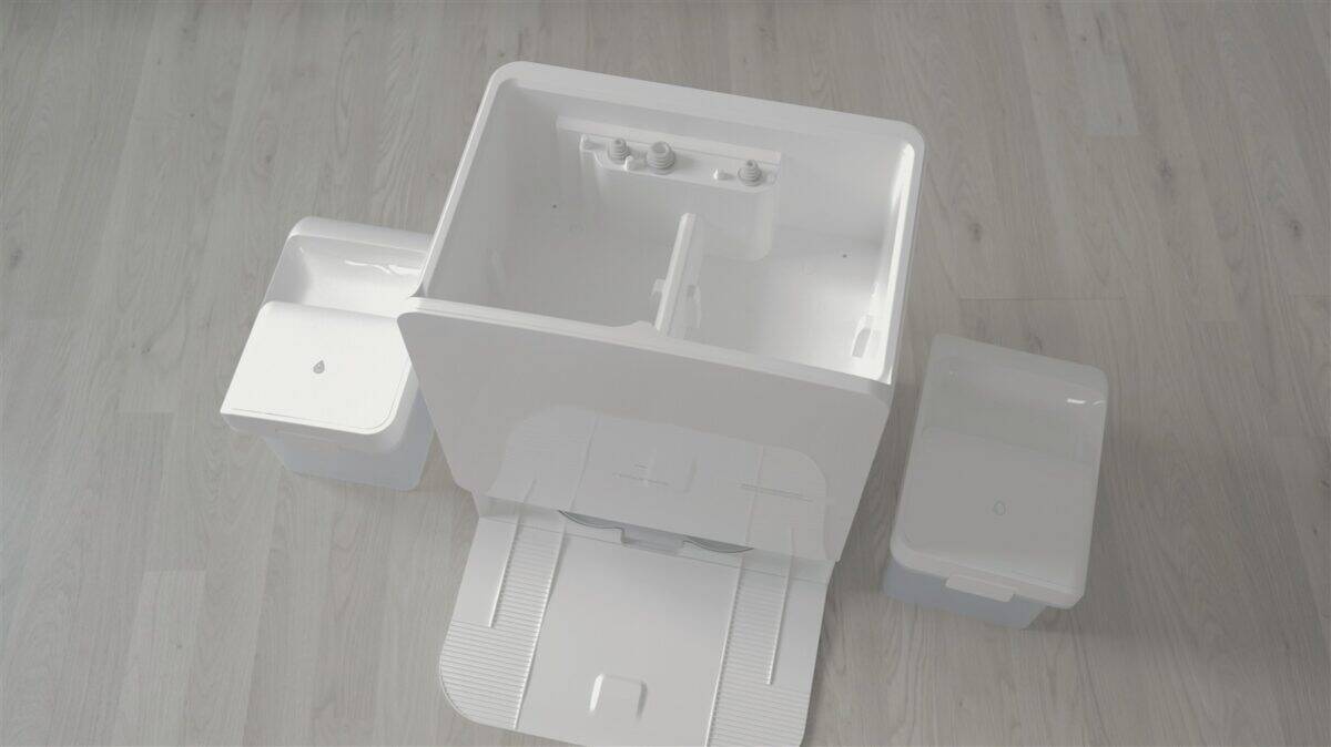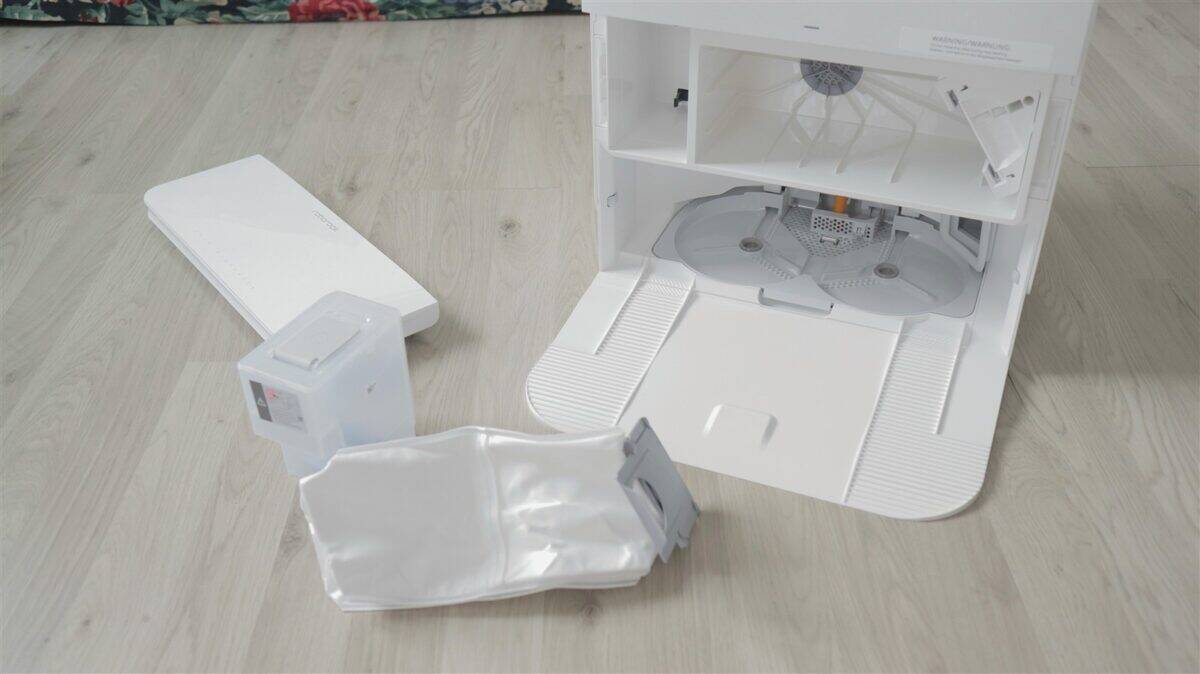 - stația de andocare preia cea mai mare parte a sarcinilor de care la alți roboți trebuie să se ocupe utilizatorul - golire automată a recipientului de praf de pe robot, curățare și igienizare a mopurilor după fiecare spălare și chiar în timpul ciclurilor mai lungi de spălare a podelelor, dozare automată a detergentului de podele etc.;